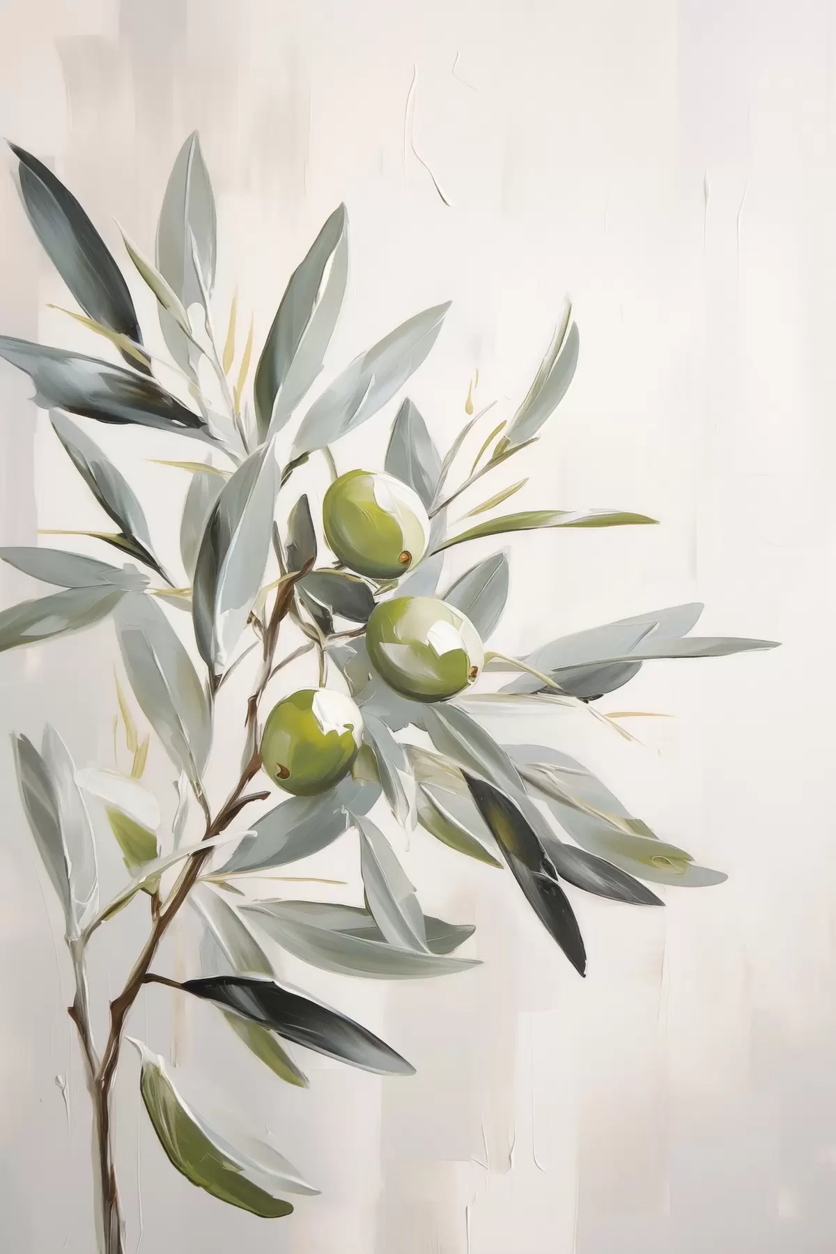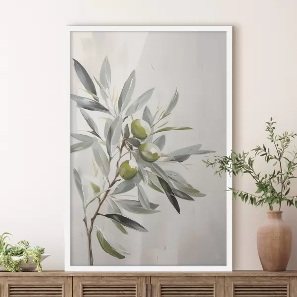Poster ramură de măslin, fruct verde, tonuri stinse, frunze, minimal, natural, pictură în ulei, botanică f45109