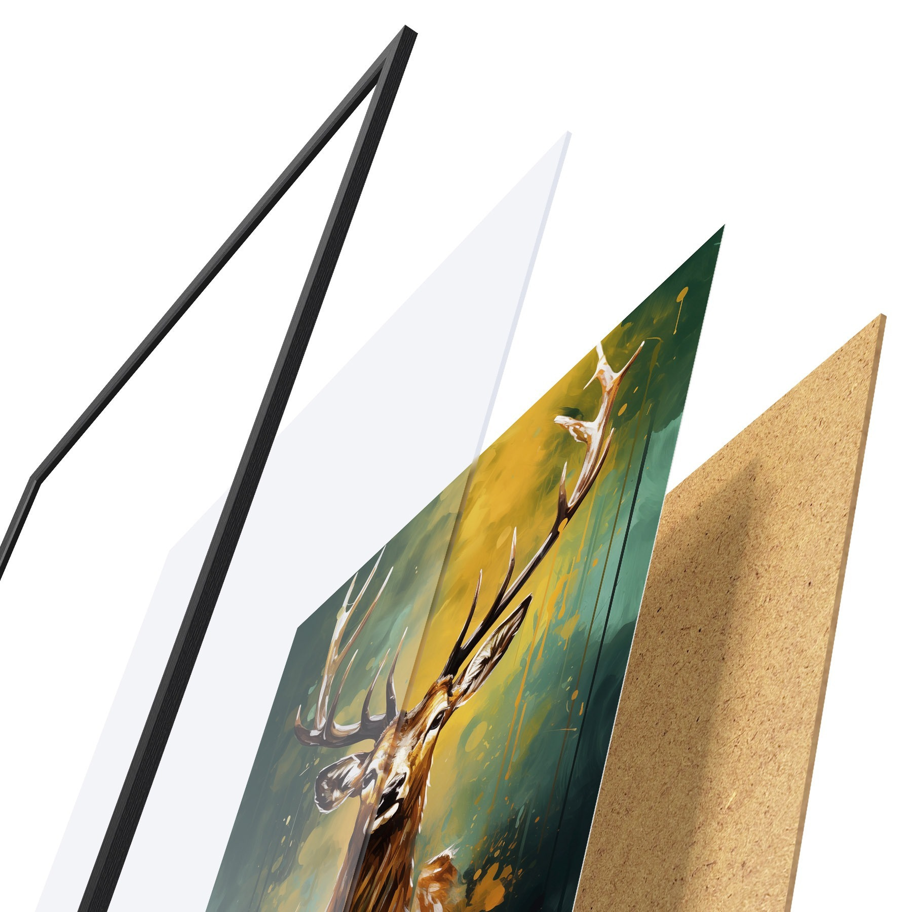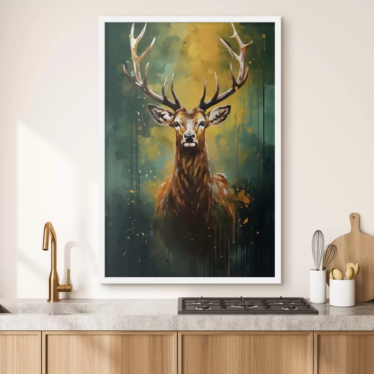 Poster cerb, coarne, verde pădure, strop portocaliu, portret animal, picurare, îndrăzneț, faună Nr f45111