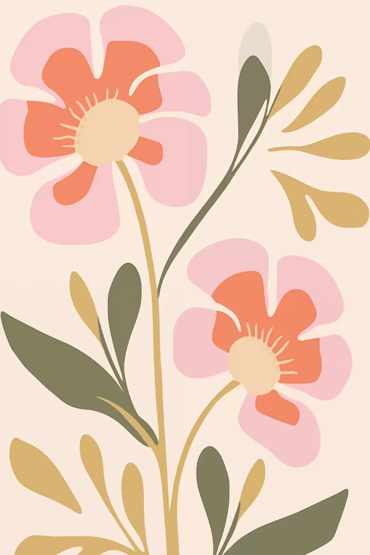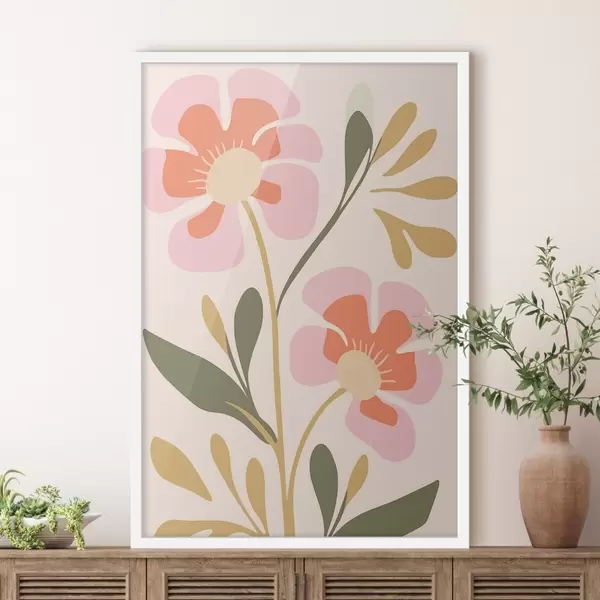 Poster Flori roz și portocalii stilizate cu frunze verzi Nr f45140