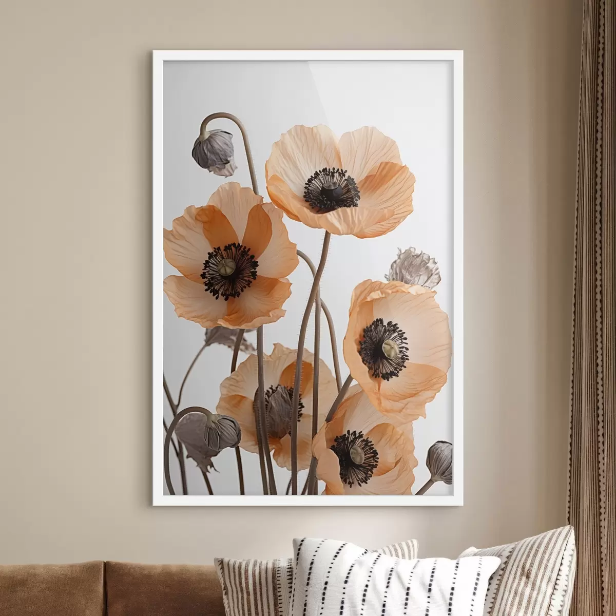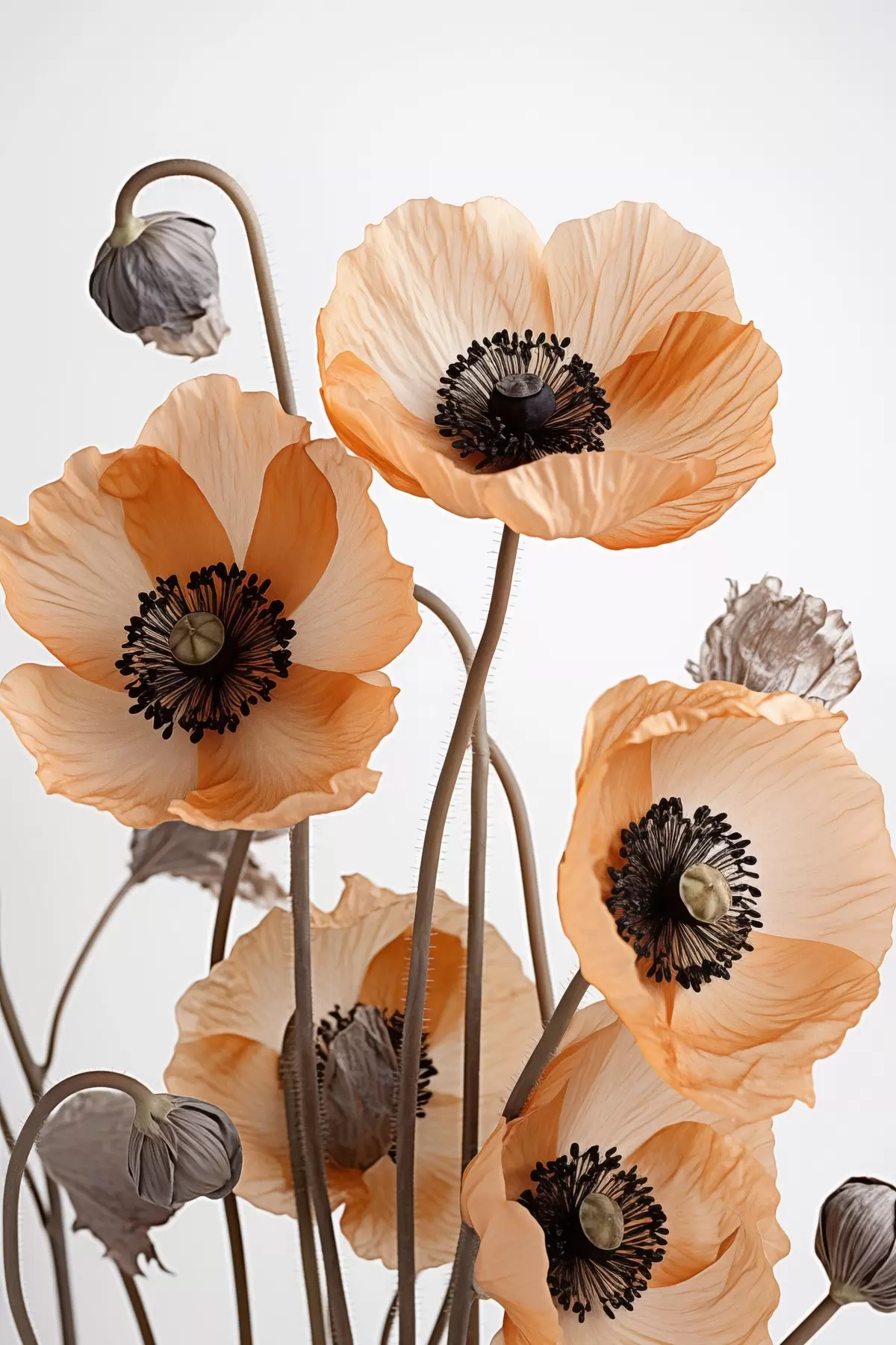Poster Mac portocaliu, flori uscate pe un fundal deschis, iluminare moale, petale delicate, aranjament floral f45167