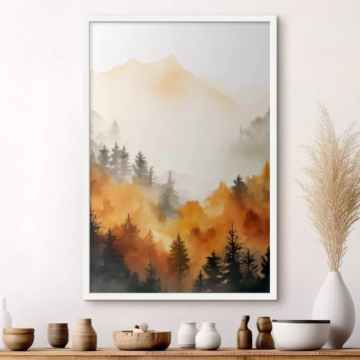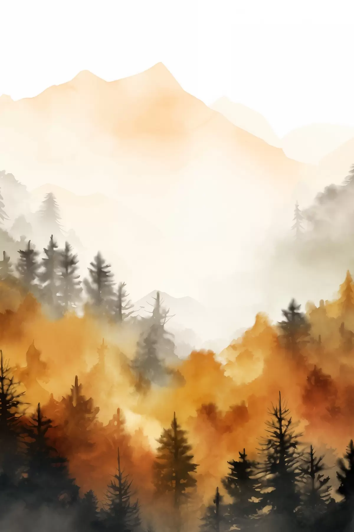 Poster O imitație de pictură peisaj acuarelă a unei păduri cu pini înalți și munți în fundal Nr f45169