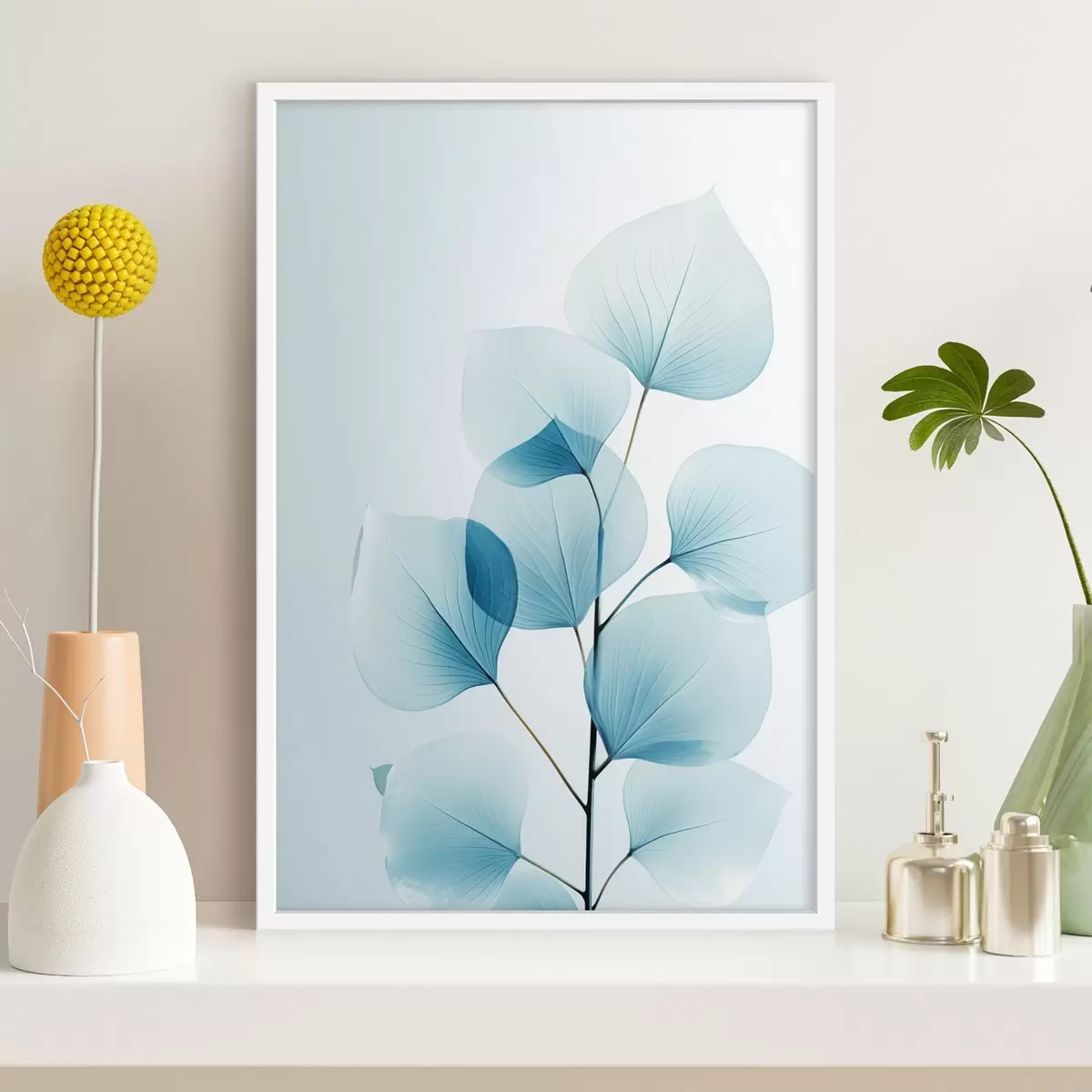 Poster Creangă cu frunze albastre translucide, vene delicate vizibile, compoziție ușoară și calmă, estetică minimalistă f45175