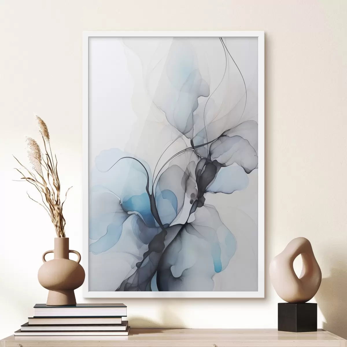 Poster Compoziție abstractă cu linii fluide și petale translucide în nuanțe de albastru, alb și bej, imitație de cerneală alcoolică f45177