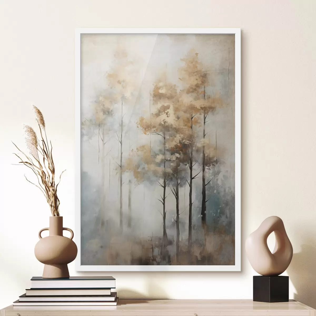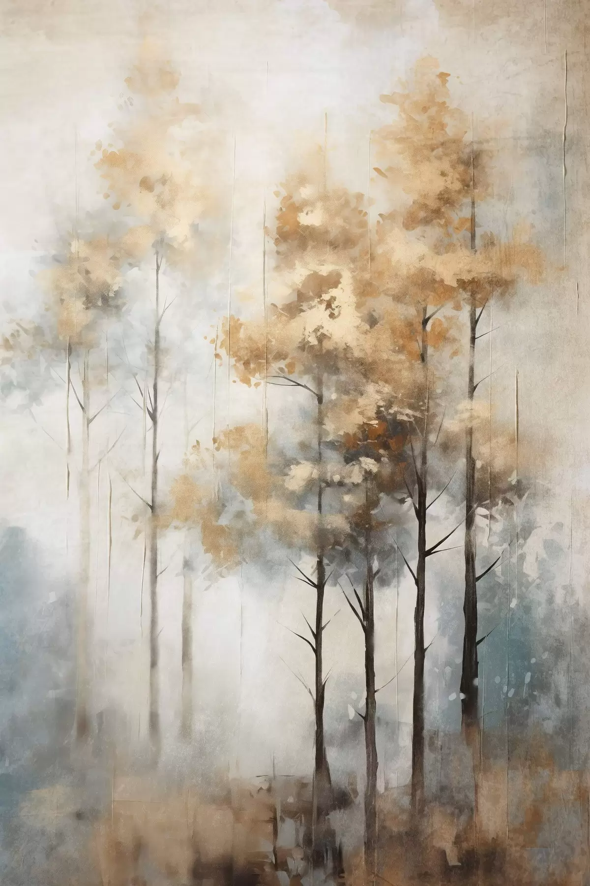 Poster Copaci înalți texturați cu frunze galbene într-o pădure, fundalul este un amestec de tonuri moi de albastru și maro Nr f45187