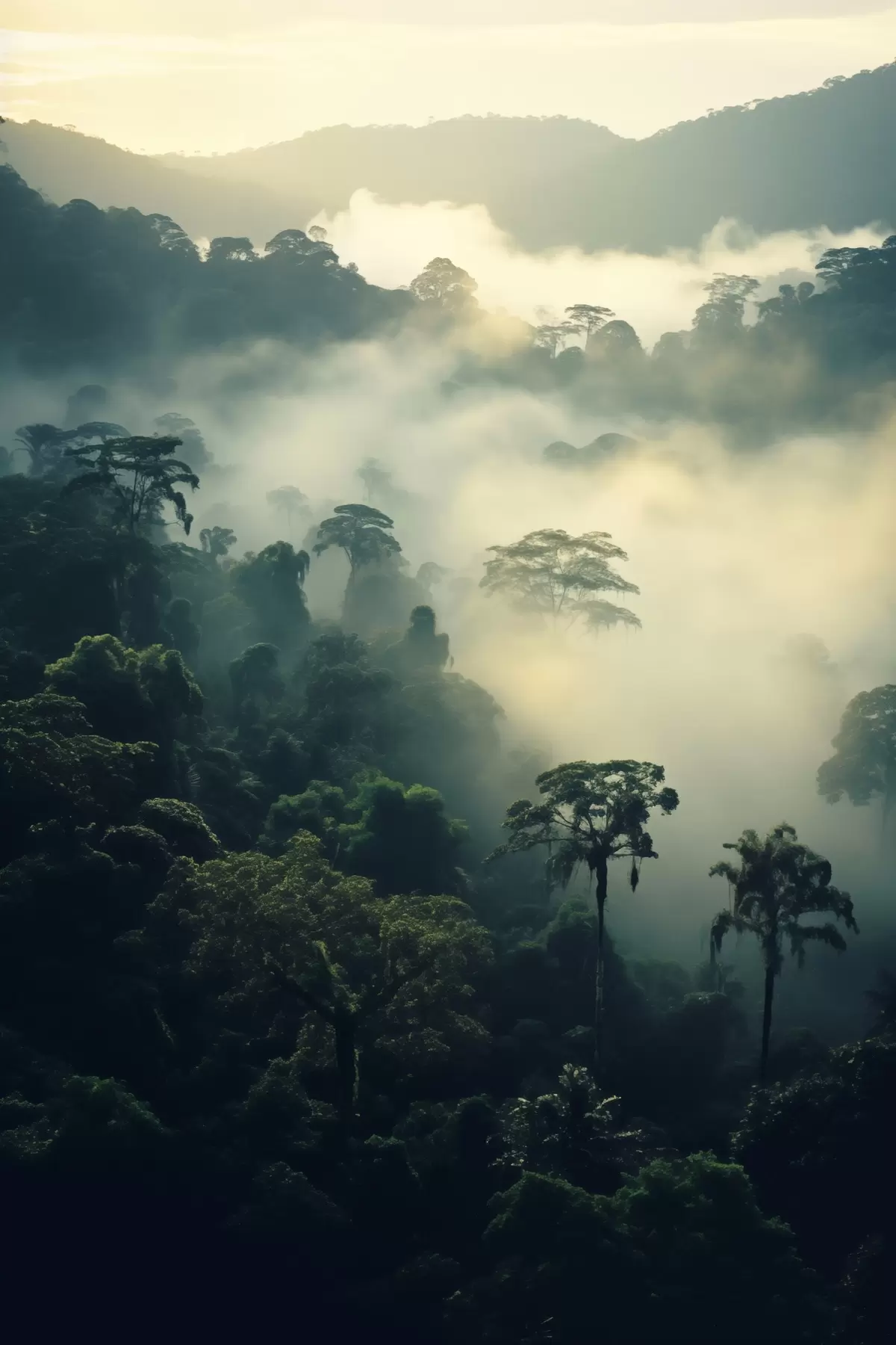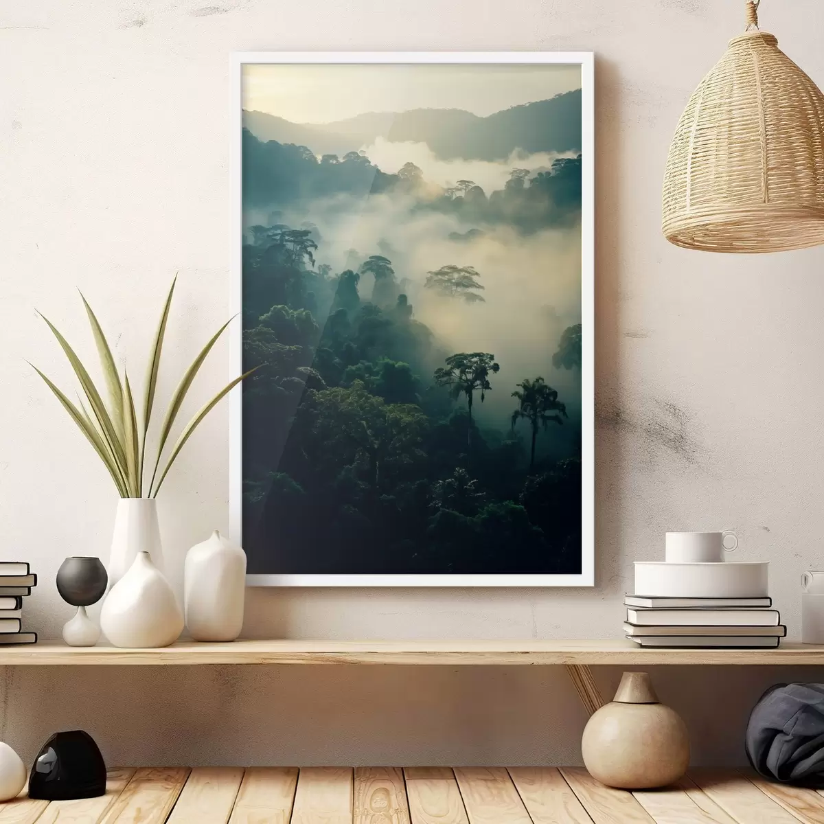 Poster Pădure tropicală cu copaci verzi luxurianți și un strat gros de ceață, creând un mediu atmosferic Nr f45190