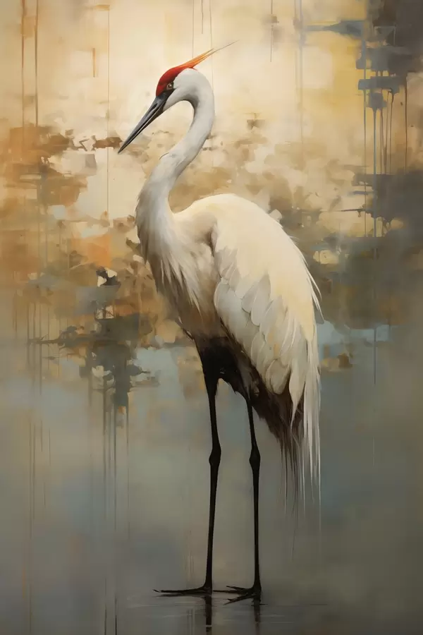 Poster Heron alb pe un fundal de nuanțe de galben, maro și albastru, sugerând un peisaj abstract, cețos Nr f45192