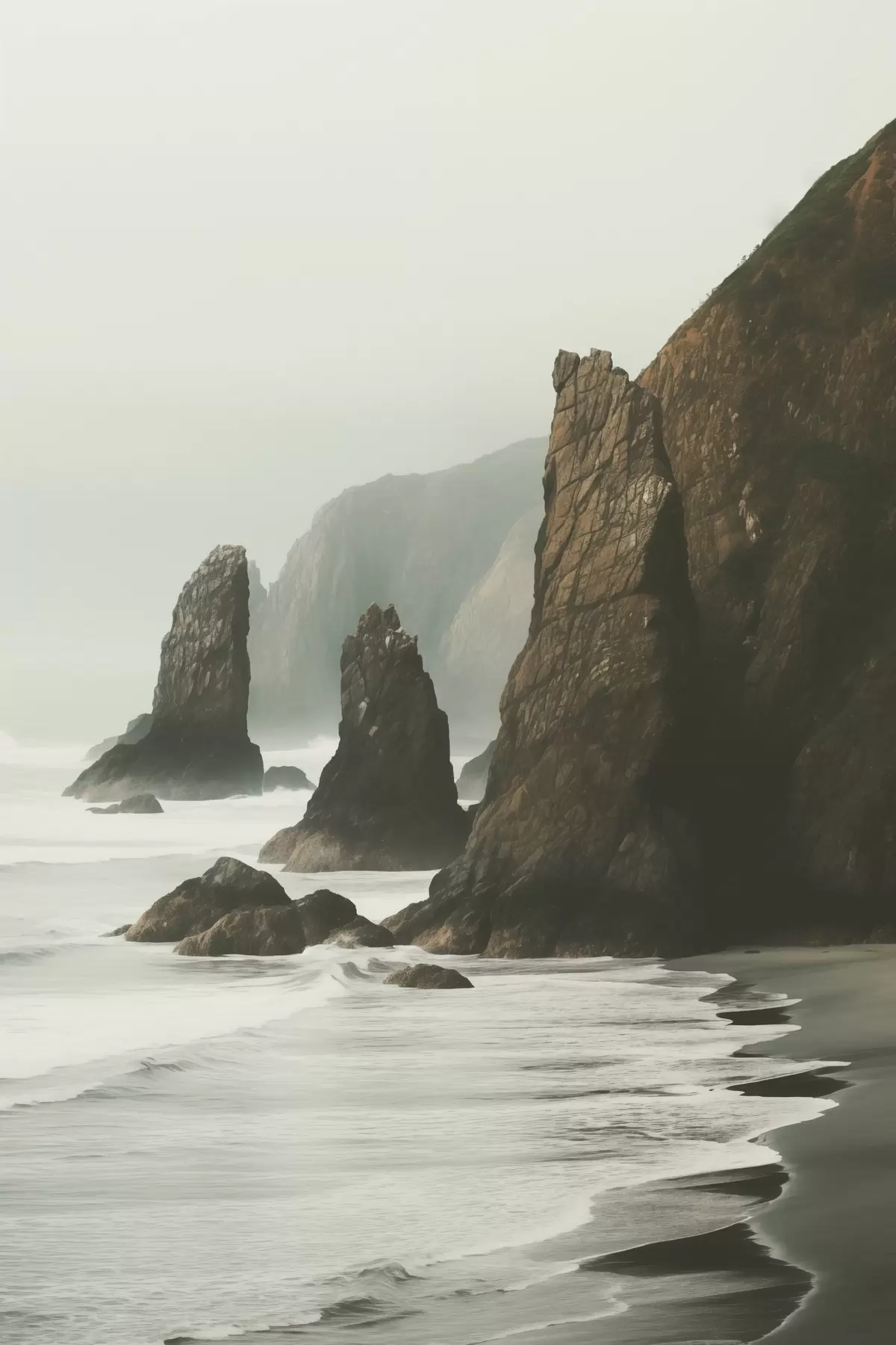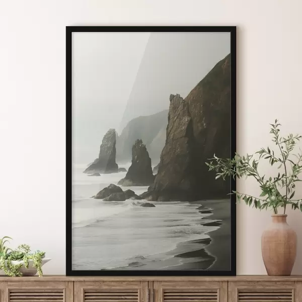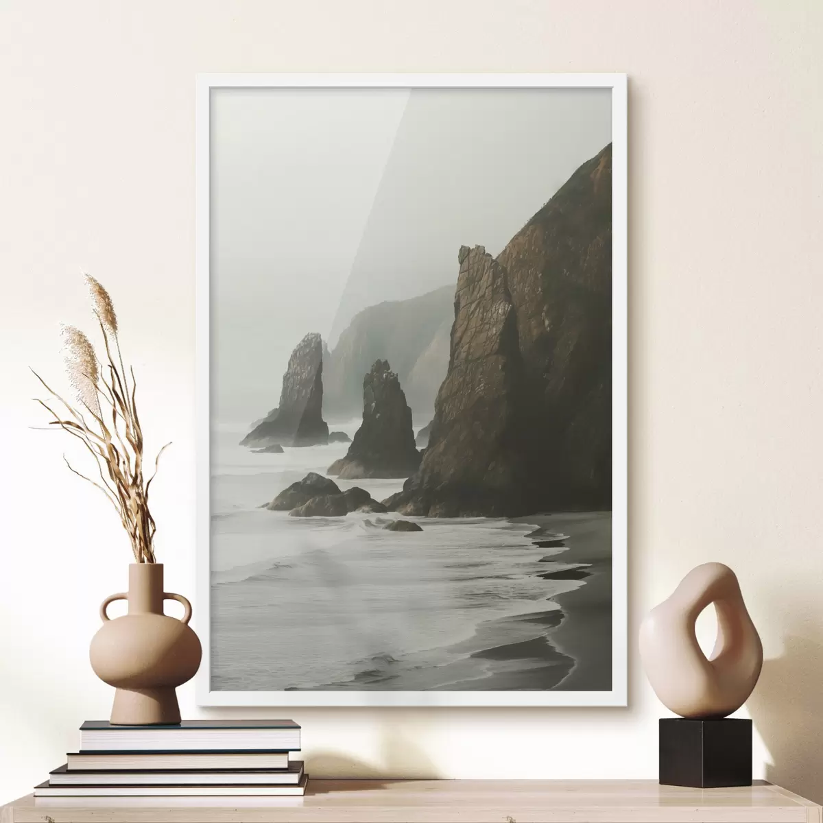 Poster Stânci stâncoase și coastă de mare, valuri care se sparg pe țărm, peisaj cu o atmosferă moody, tonuri de pământ Nr f45193