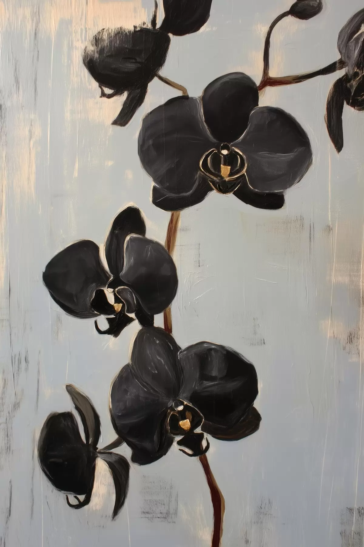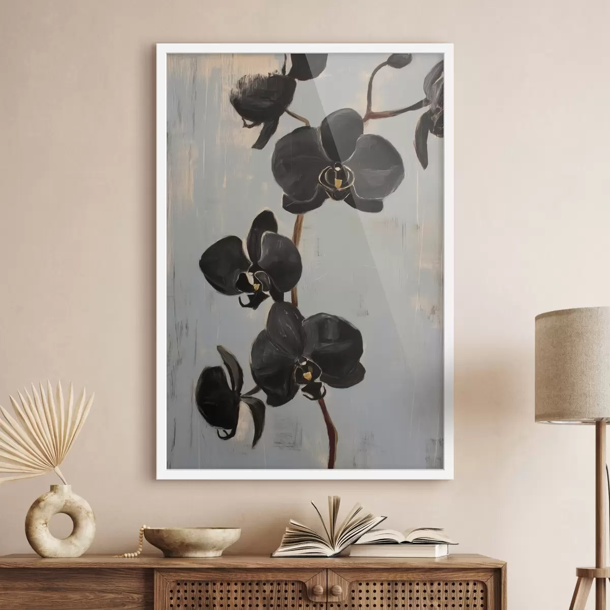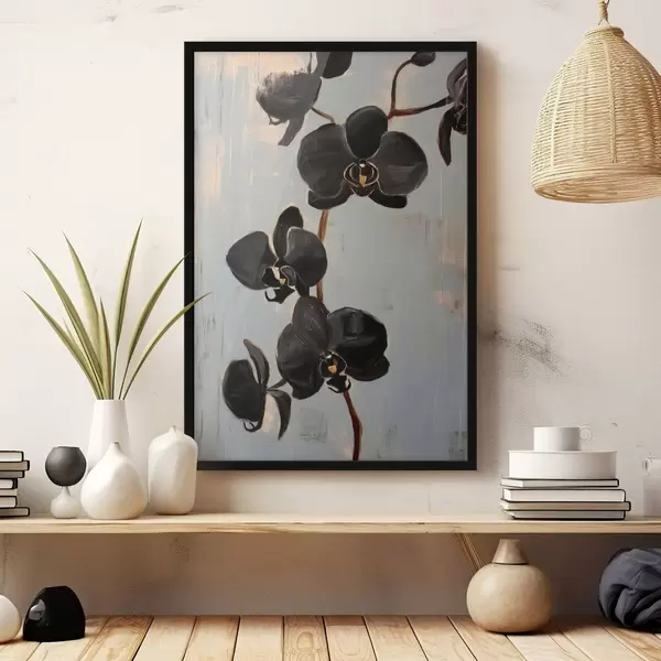 Poster Orhidee decorative: flori negre pe un fundal gri Nr f45547