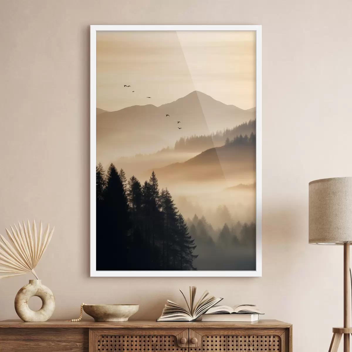 Poster Un peisaj montan cu o pădure și păsări care zboară pe cer , toate acoperite de un strat gros de ceață în timpul răsăritului f45563