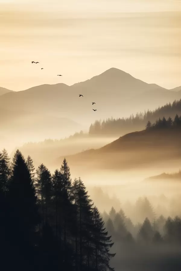 Poster Un peisaj montan cu o pădure și păsări care zboară pe cer , toate acoperite de un strat gros de ceață în timpul răsăritului f45563