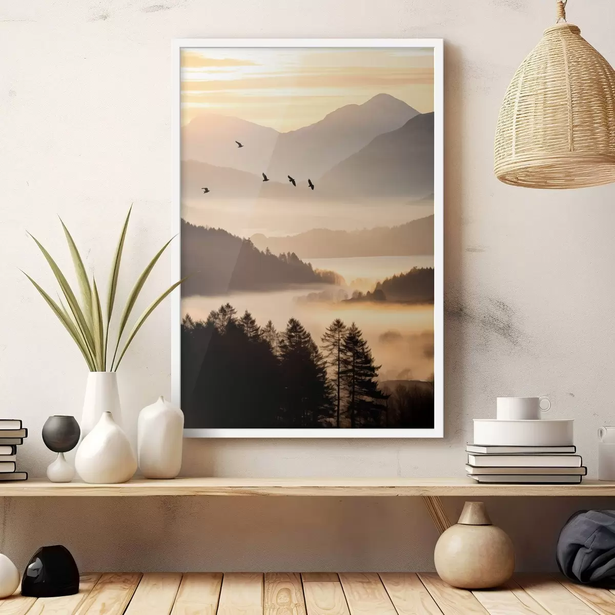 Poster Un peisaj montan cu o pădure și păsări care zboară pe cer , toate acoperite de un strat gros de ceață în timpul răsăritului f45564