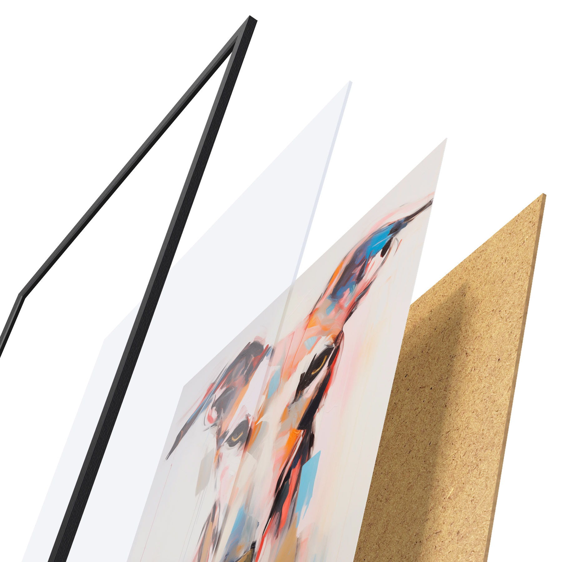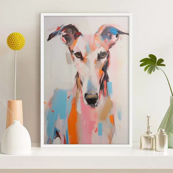 Poster Un câine greyhound, pictat cu culori vibrante precum portocaliu, roz și albastru, pe un fundal alb simplu f45565