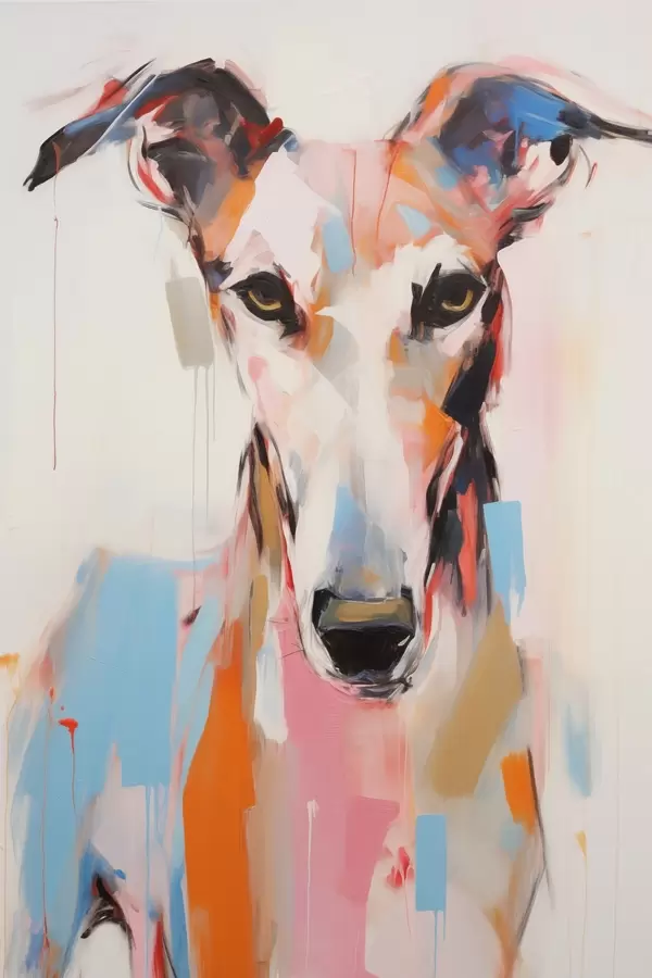 Poster Un câine greyhound, pictat cu culori vibrante precum portocaliu, roz și albastru, pe un fundal alb simplu Nr f45565