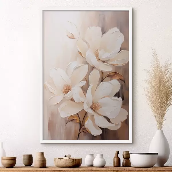 Poster Flori albe de magnolie pe un fundal blând, estompat de tonuri bej și maro, compoziție florală elegantă f45571
