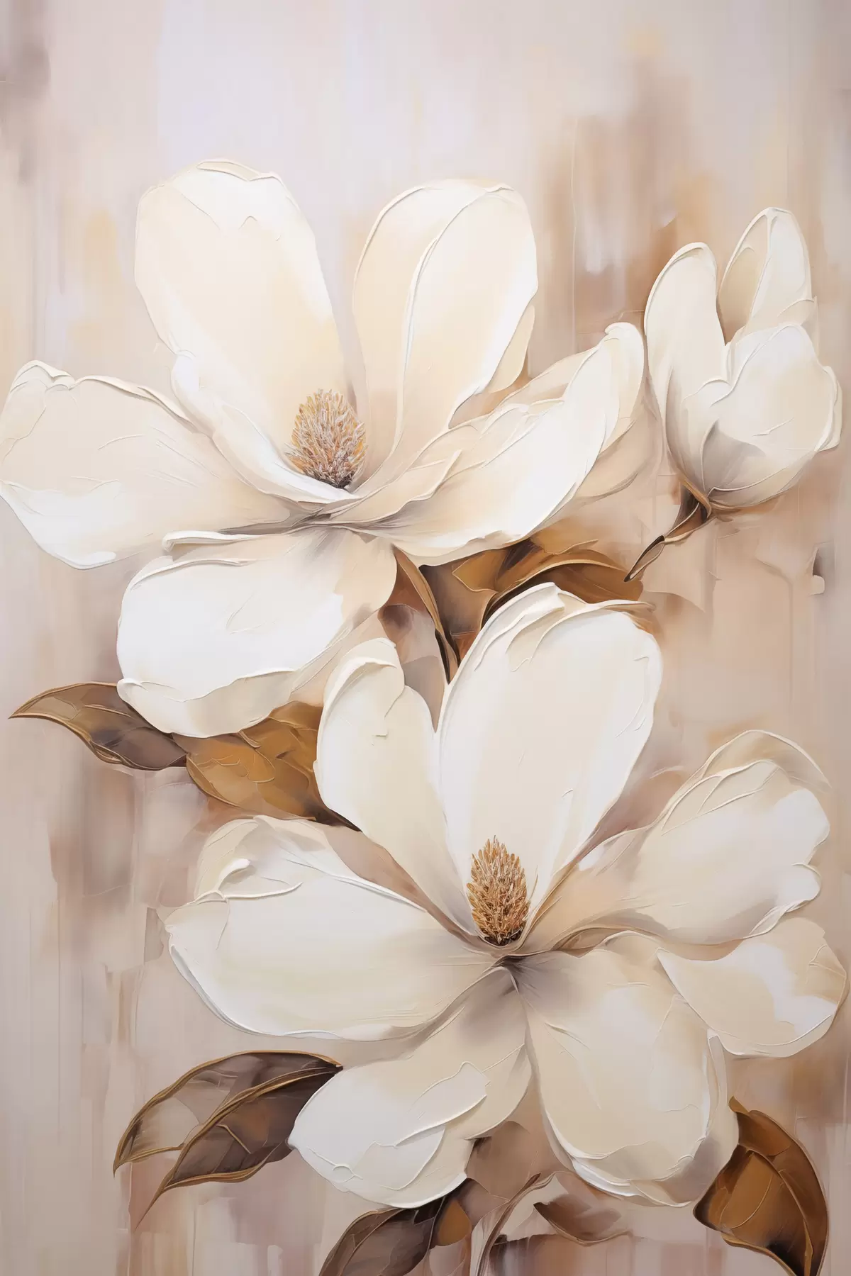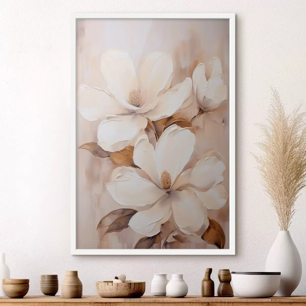 Poster Flori albe de magnolie pe un fundal blând, neclar, cu tonuri de bej și maro, stil pictură Nr f45572