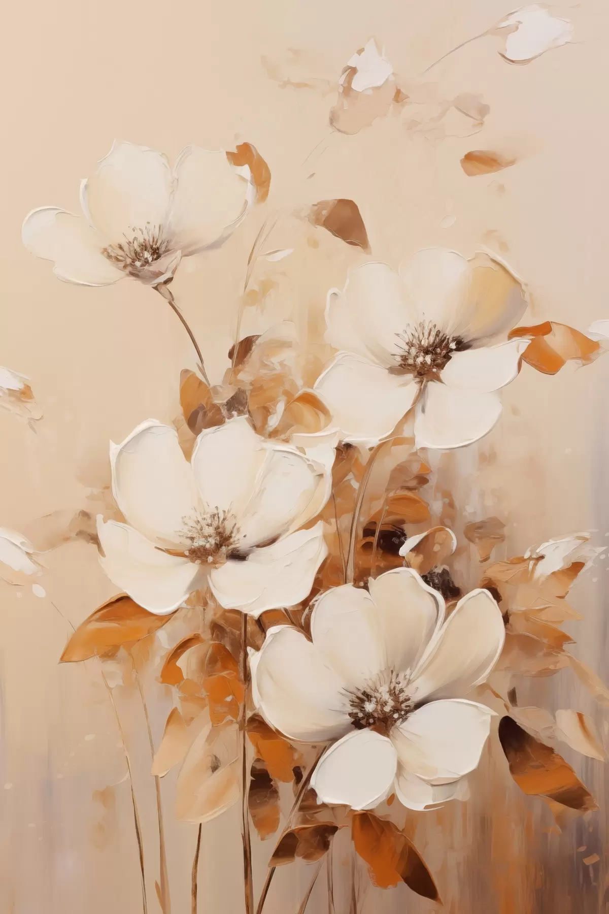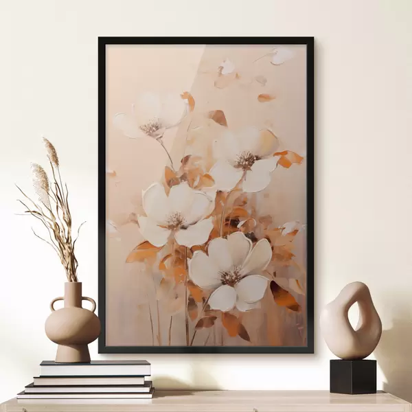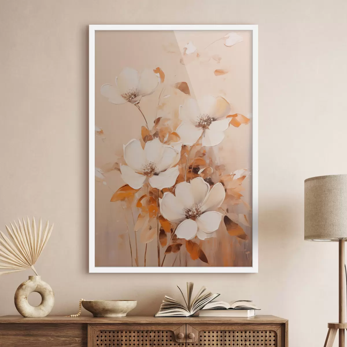Poster Flori albe cu frunze portocalii, tușe delicate, paletă de culori calde, compoziție elegantă f45573