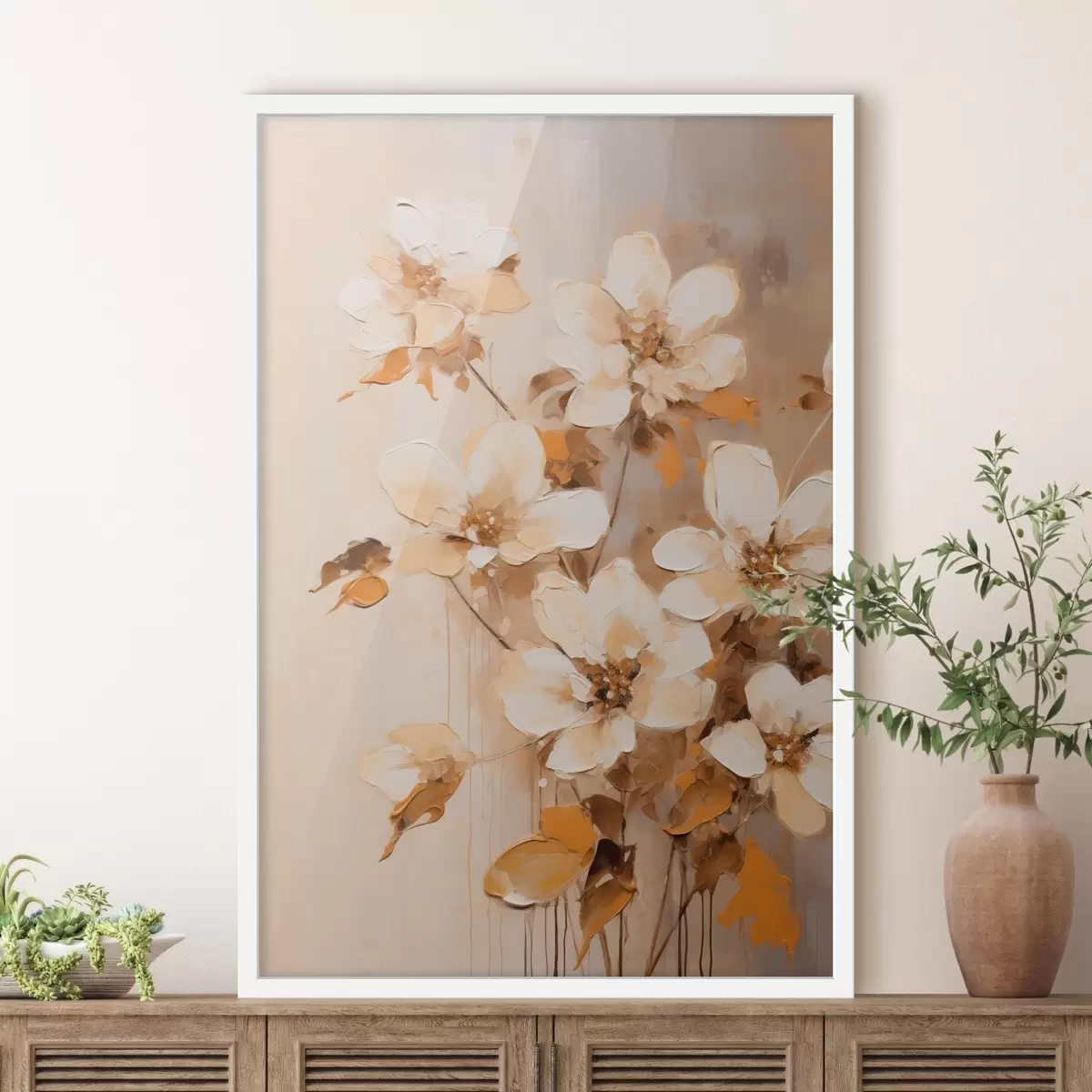 Poster Flori albe cu frunze portocalii, tușe delicate, aranjament floral, artă botanică Nr f45574