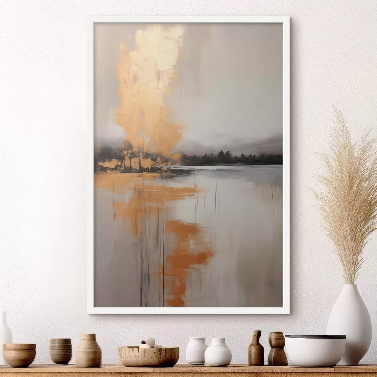 Poster Un peisaj abstract cu un lac, copac și ceață galbenă , apa reflectă și cerul înnorat Nr f45575