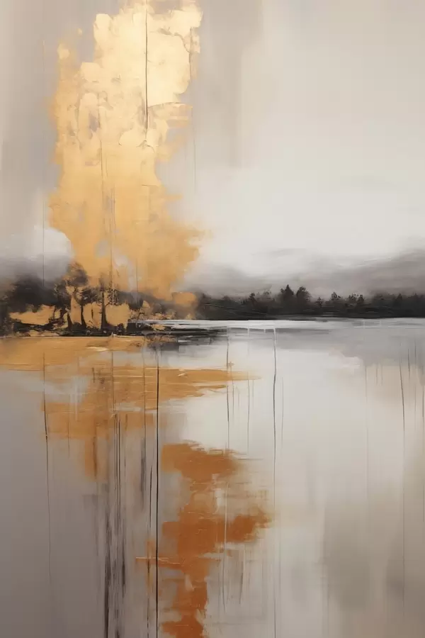 Poster Un peisaj abstract cu un lac, copac și ceață galbenă , apa reflectă și cerul înnorat Nr f45575