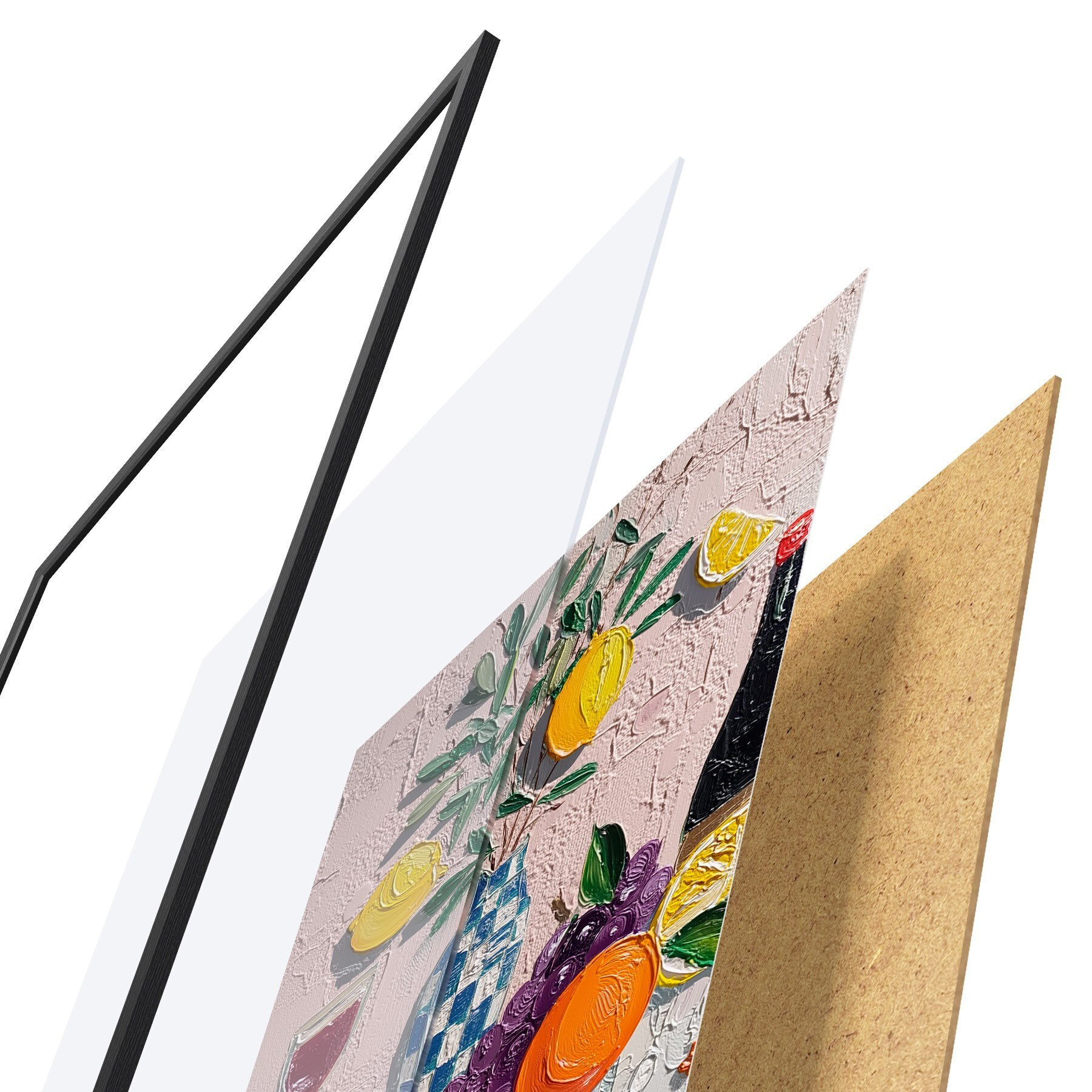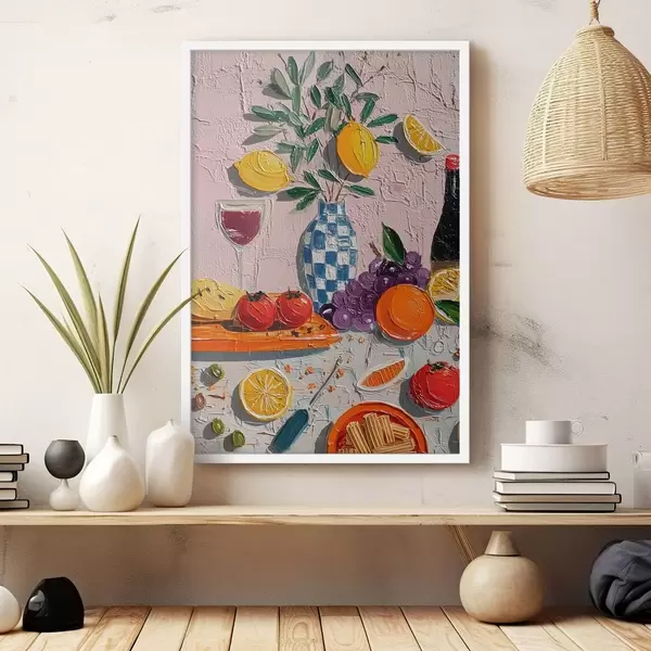 Poster Natură moartă în culori pastelate: lămâi, struguri și roșii, impasto Nr f45876