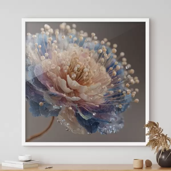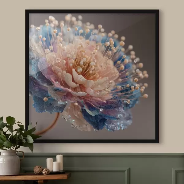 Poster Floare perlată cu picături de rouă, petale de culoare piersic și albastru Nr f45911