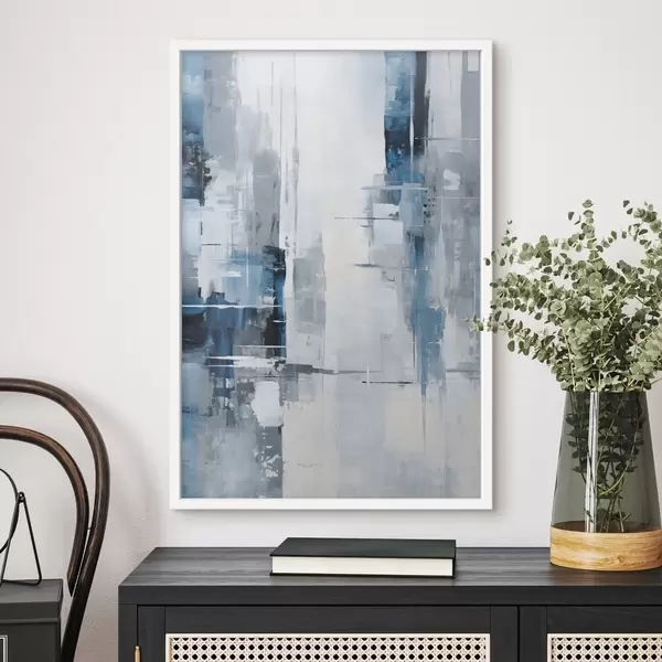 Poster Imitare de pictură abstractă cu culori albastru, gri și alb, linii verticale și forme geometrice f45926