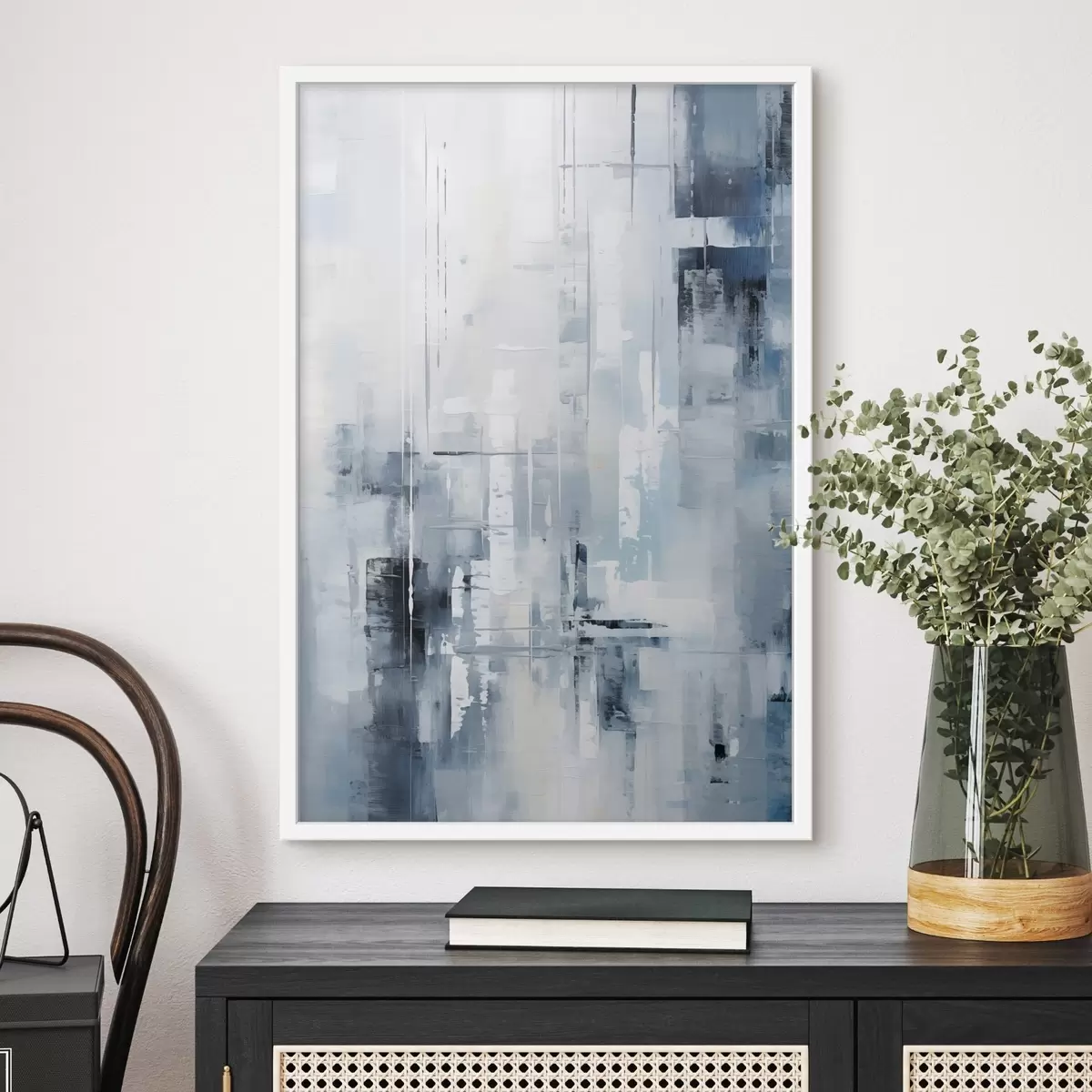 Poster Imitare de pictură abstractă cu culori albastru, gri și alb, linii verticale și forme geometrice f45927