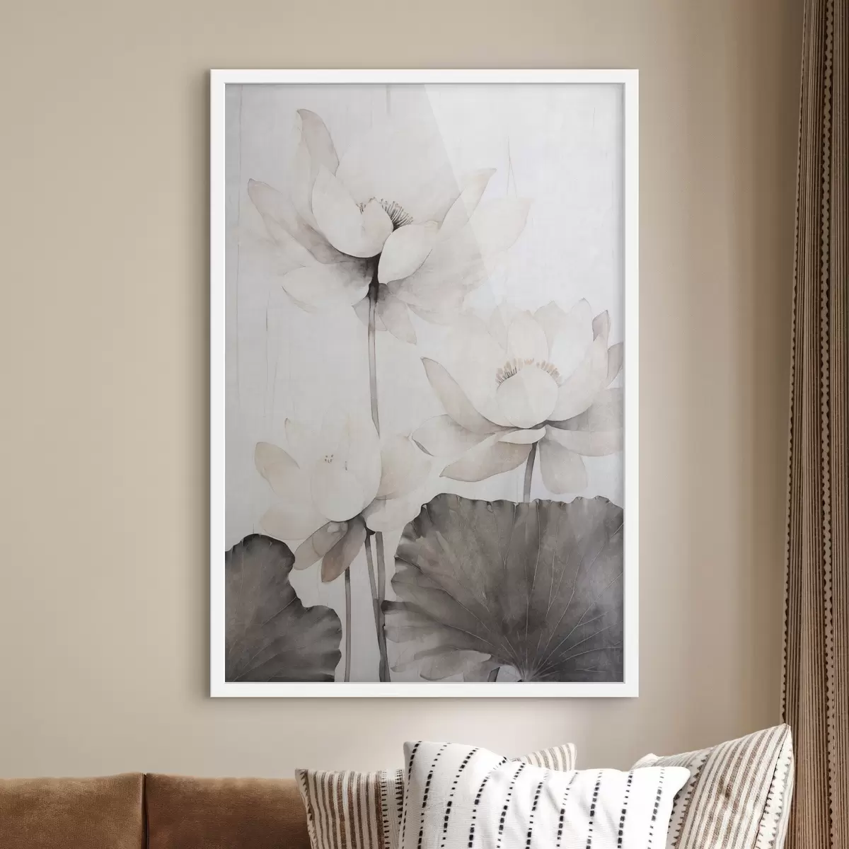 Poster Flori de lotus albe texturate cu frunze întunecate, fundal deschis, design minimalist Nr f45936