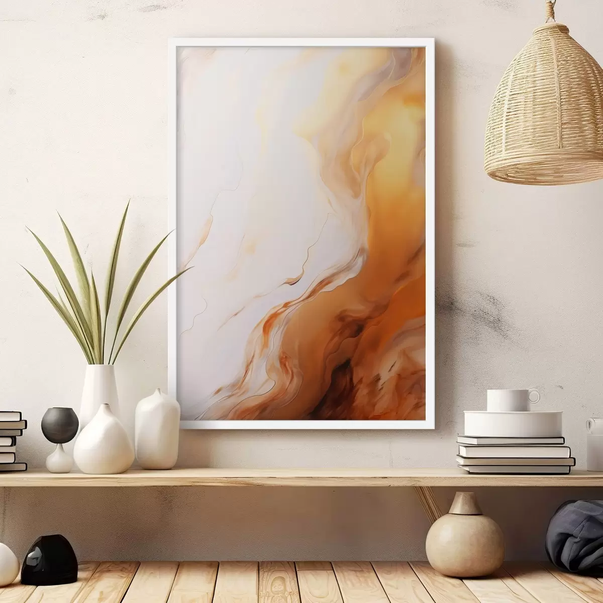 Poster Imitare de pictură abstractă cu culori albe și portocalii, artă fluidă cu linii ondulate, artă modernă f45939