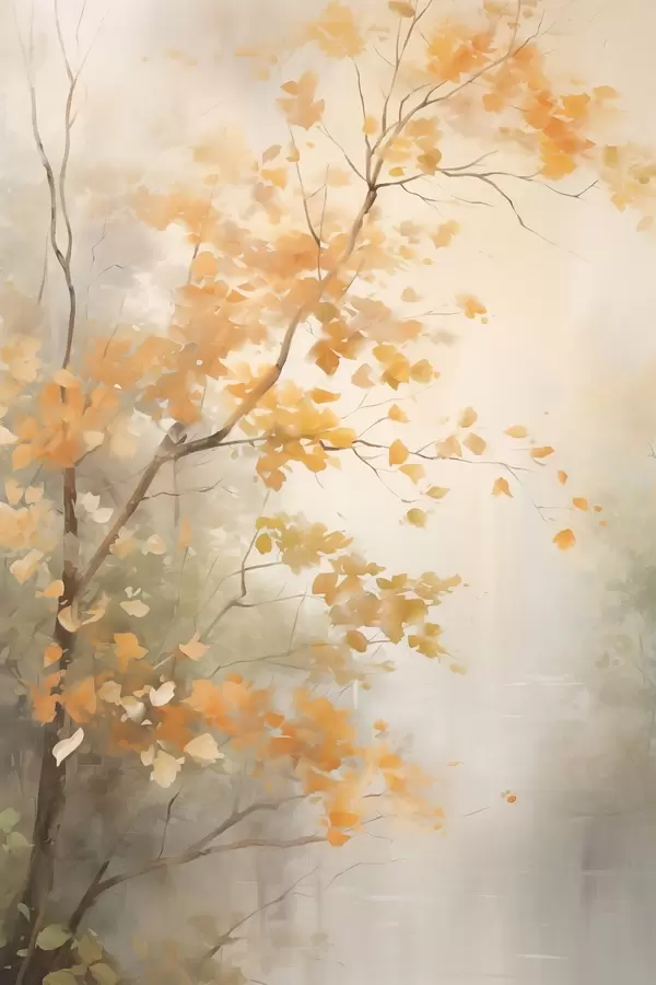 Poster Ramuri de copaci de toamnă cu frunze portocalii într-o pădure cu lumină difuză Nr f45940