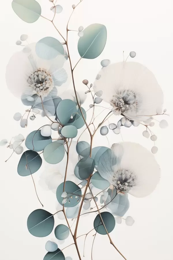 Poster Flori abstracte de eucalipt cu petale albe, frunze verzi discrete pe ramuri Nr f45946