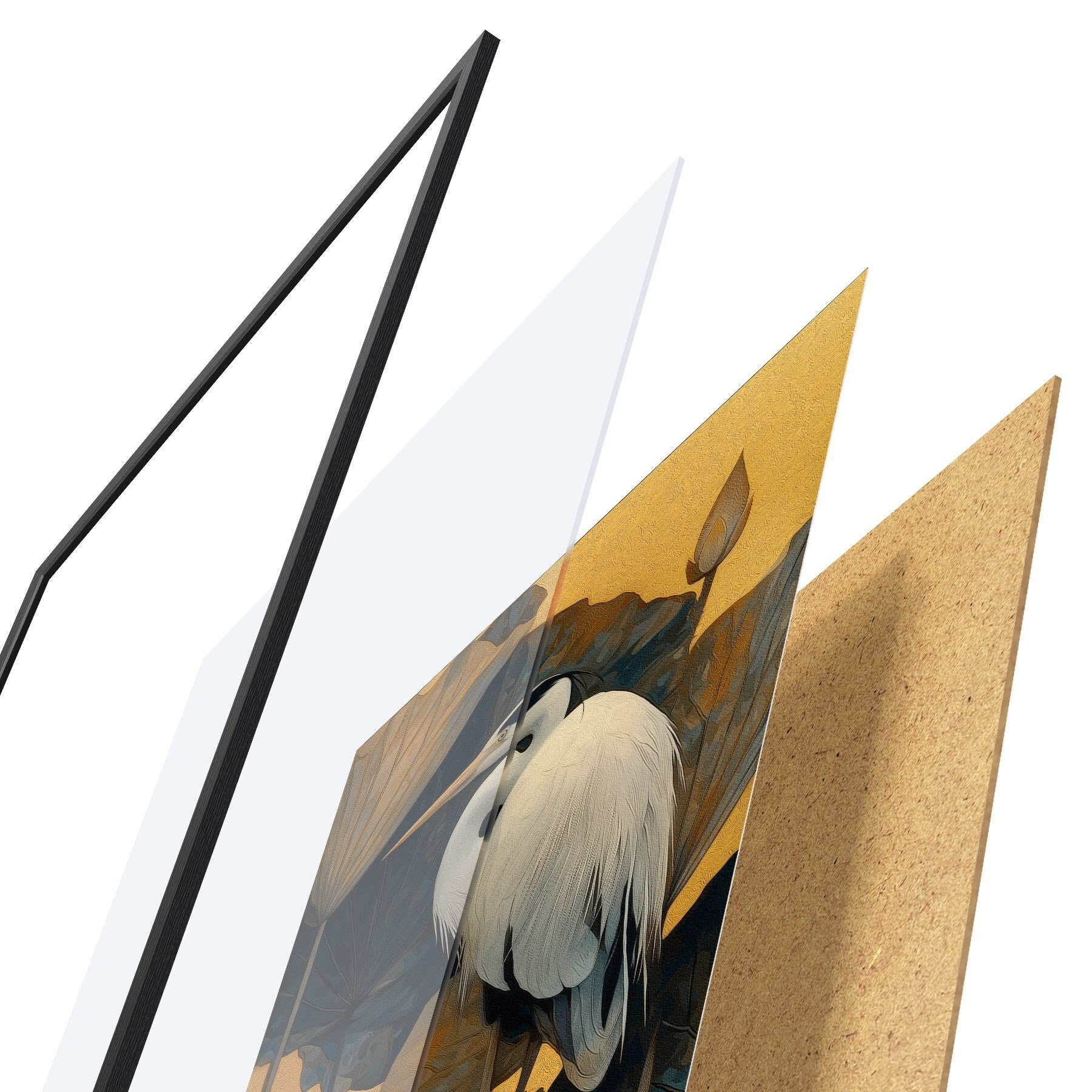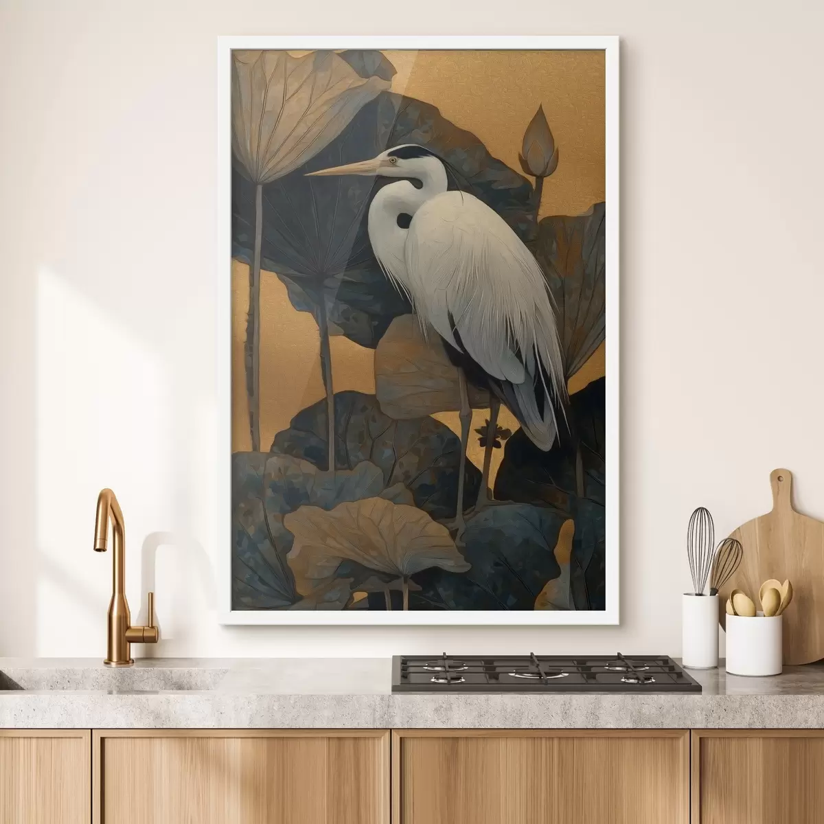 Poster Stârc alb printre frunze mari pe un fundal cald Nr f46147