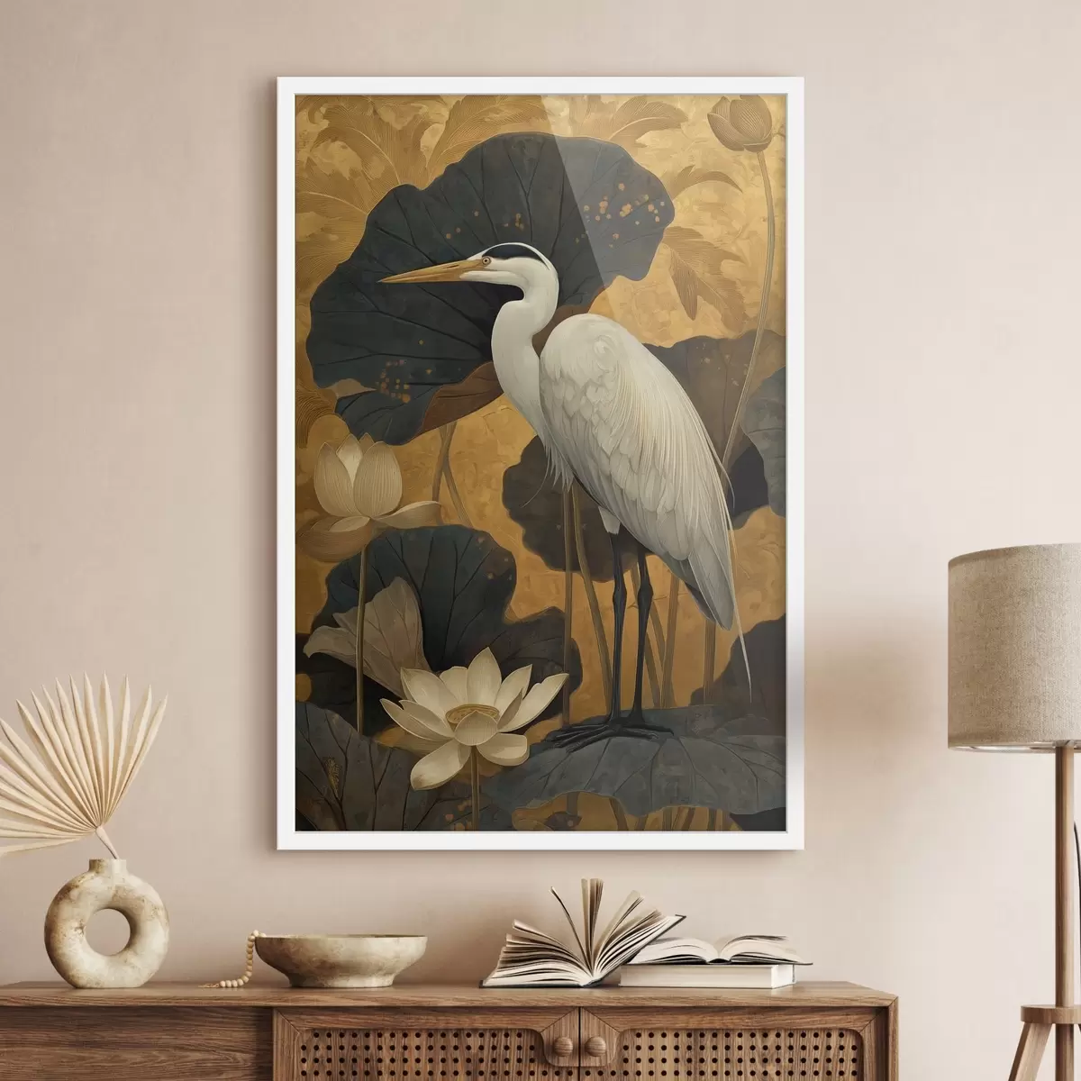 Poster Stârc printre lotuși pe un fundal cald Nr f46148
