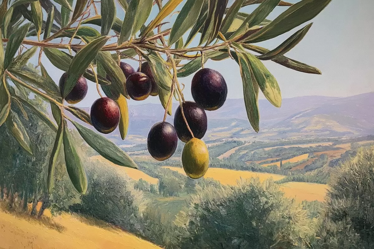 Poster Ramură de măslin cu fructe negre pe fundalul unui peisaj de vară Nr f46150