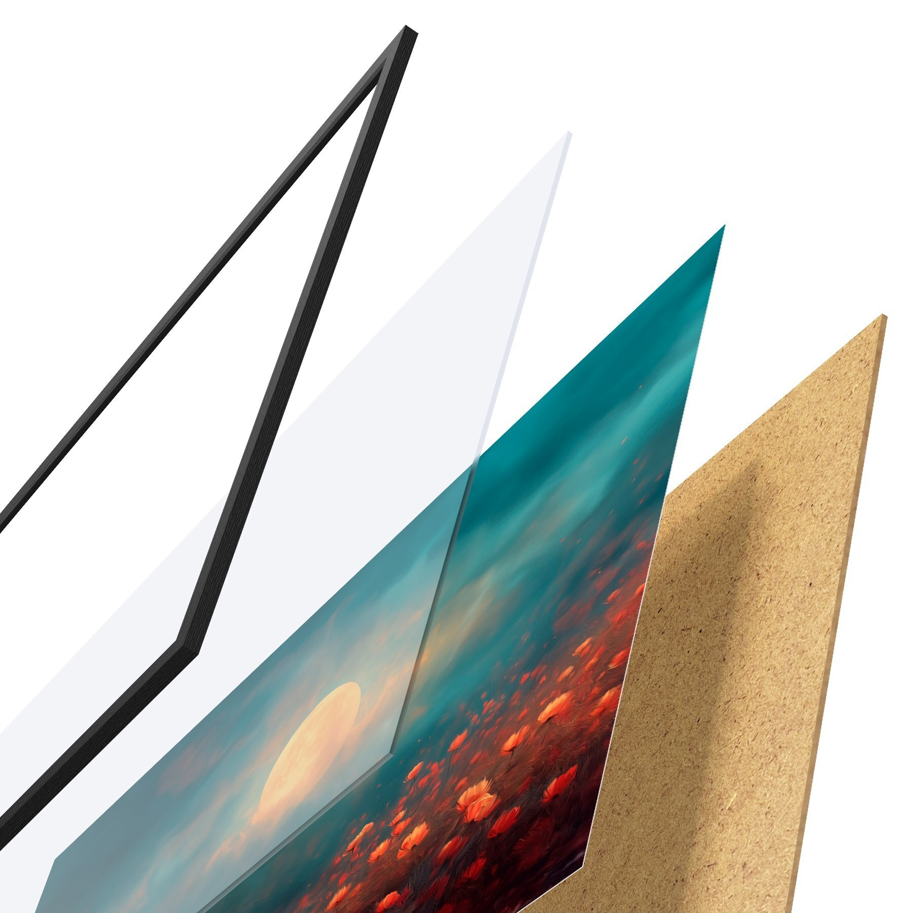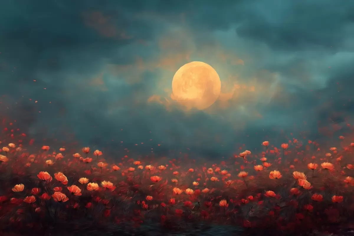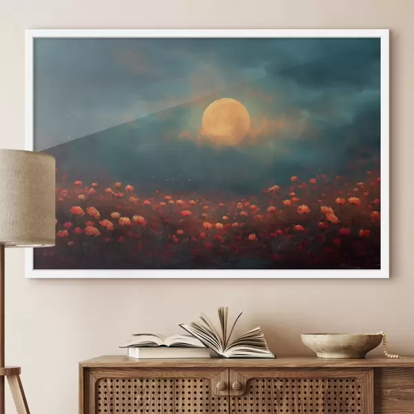 Poster Luna deasupra unui câmp de flori roșii într-un cer cețos de seară Nr f46167