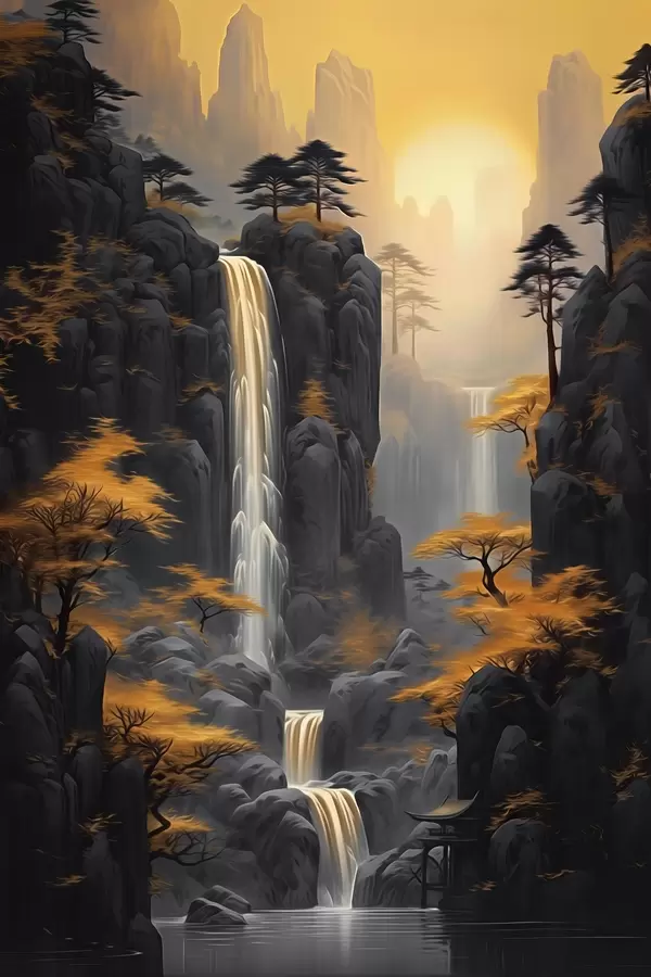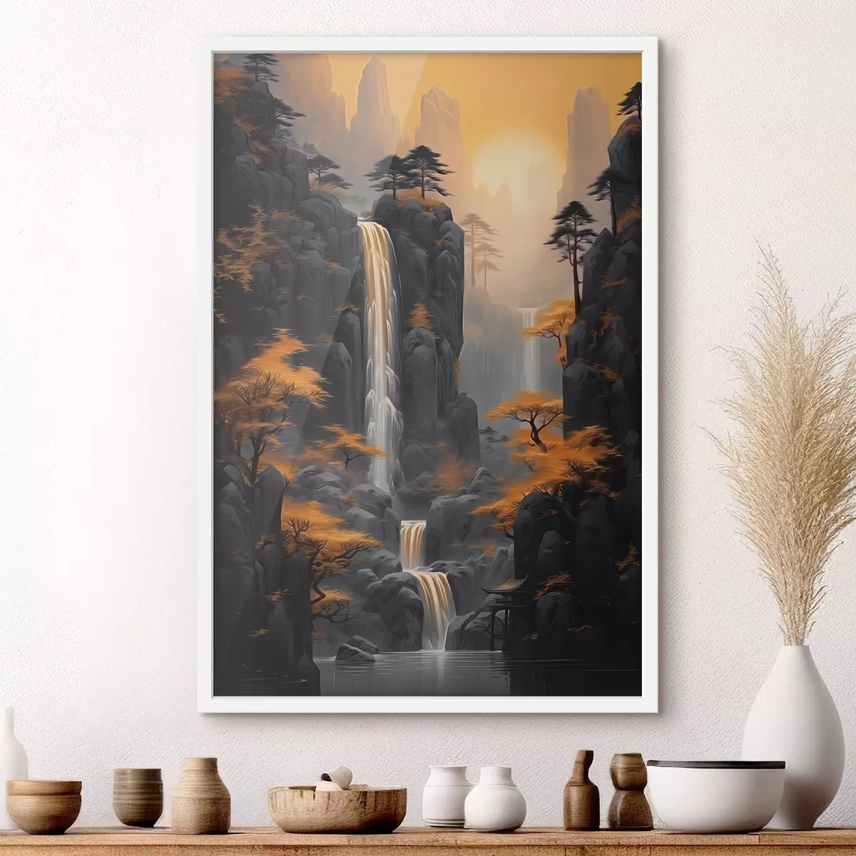 Poster Peisaj stâncos cu o cascadă în tonuri calde de apus de soare Nr f46177
