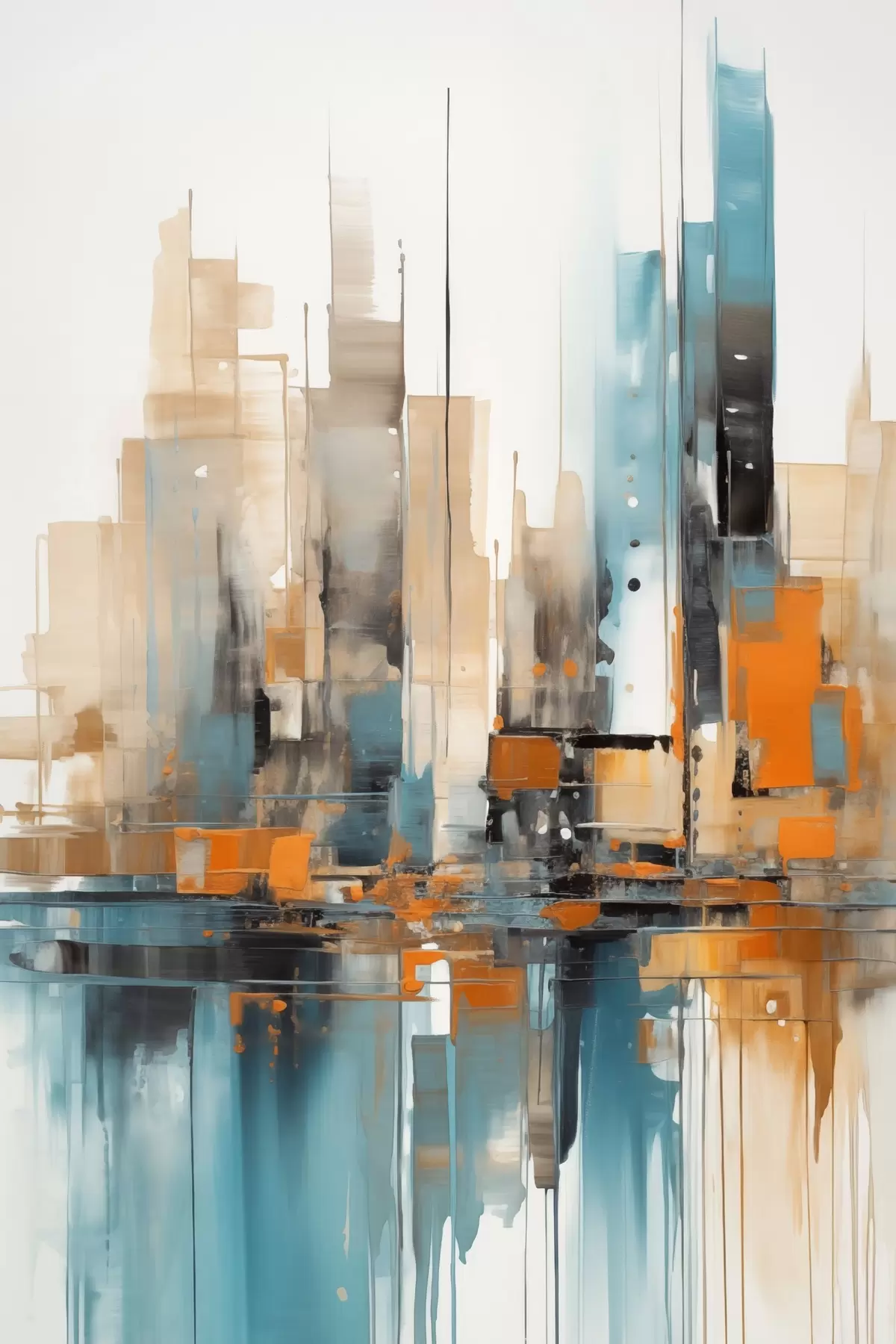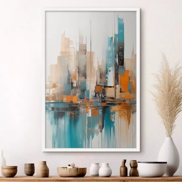 Poster Peisaj urban abstract cu portocaliu, verde-albastru și maro, pensule verticale și forme geometrice Nr f46266