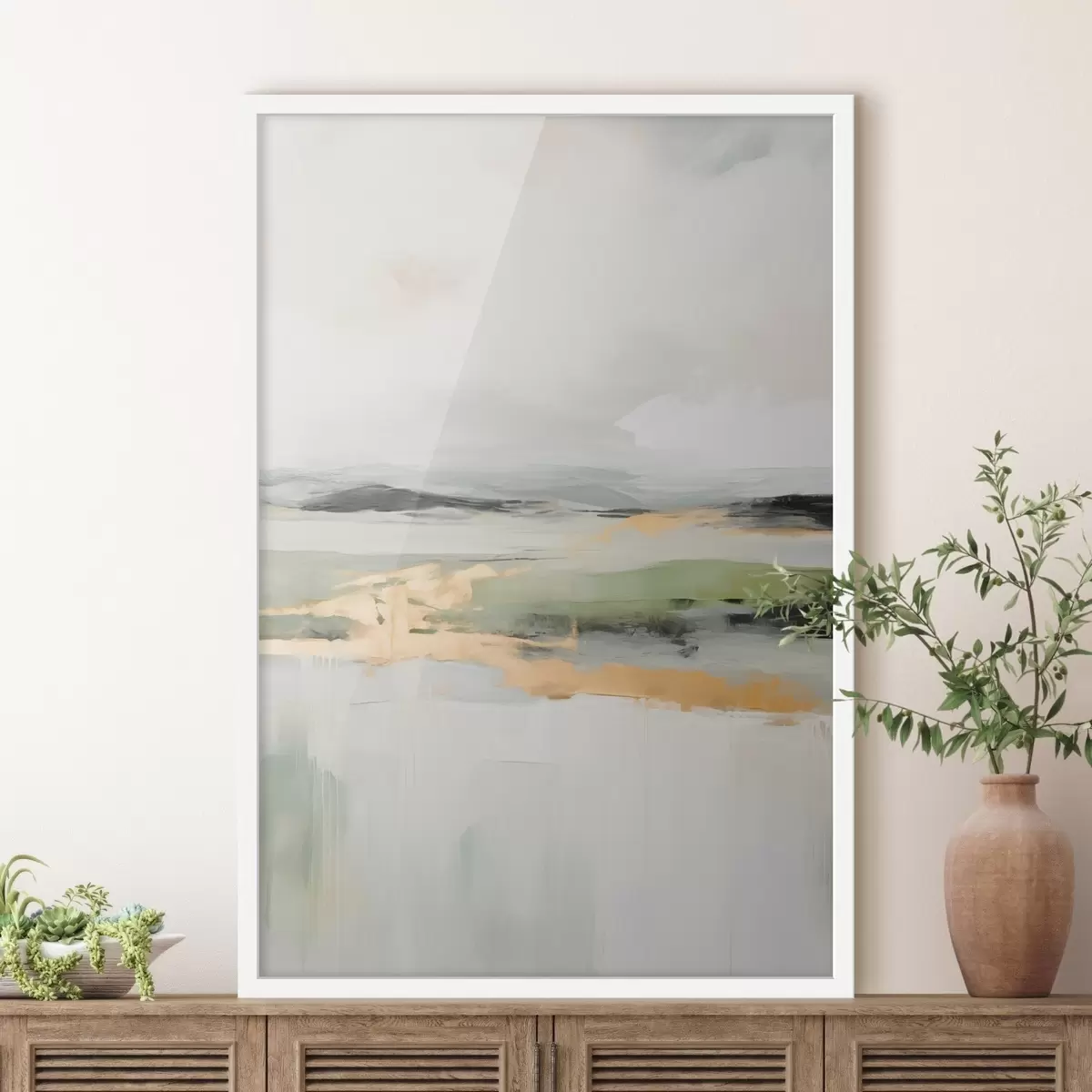Poster Peisaj abstract cu accente galbene, o compoziție minimalistă de pământ, apă și cer, cu culori discrete f46269