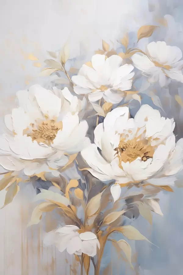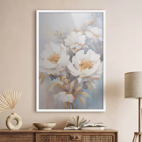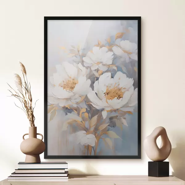 Poster Bujori albi cu mijloc și frunze albastre, tușe delicate, fundal albastru deschis, aranjament floral Nr f46270