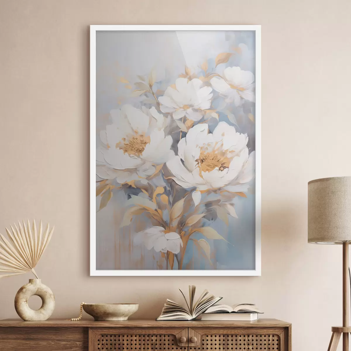 Poster Bujori albi cu mijloc și frunze albastre, tușe delicate, fundal albastru deschis, aranjament floral f46270