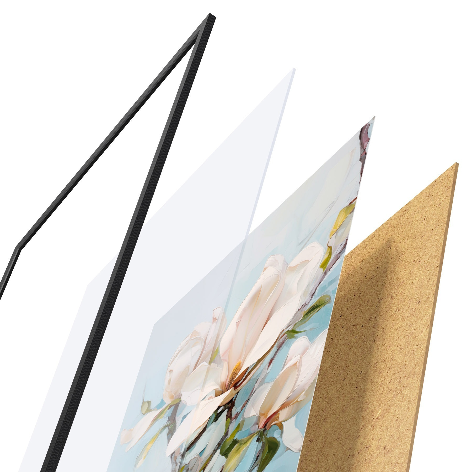 Poster Flori albe de magnolie, fundal albastru deschis cu tușe delicate, stil pictură în ulei, textură impasto Nr f46277