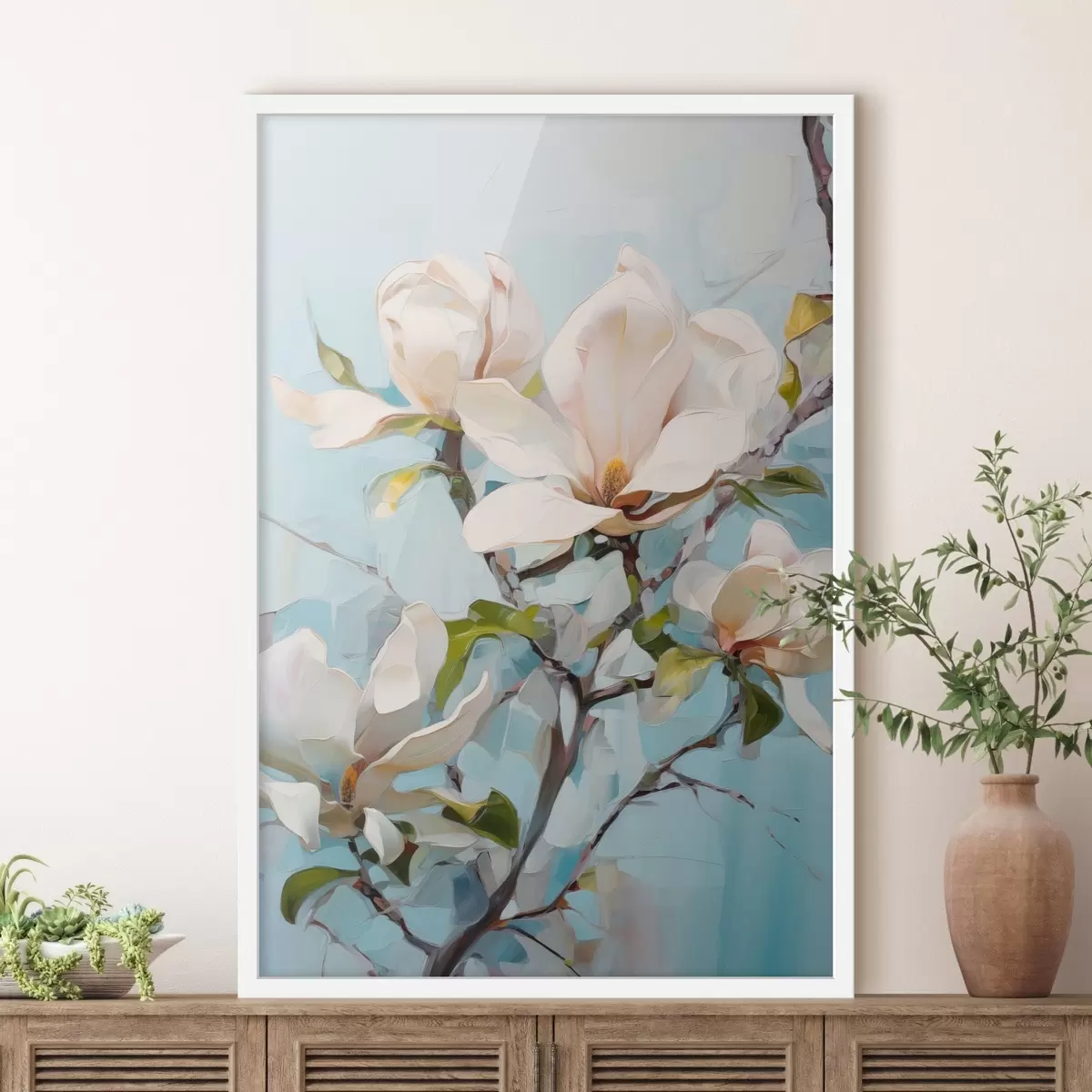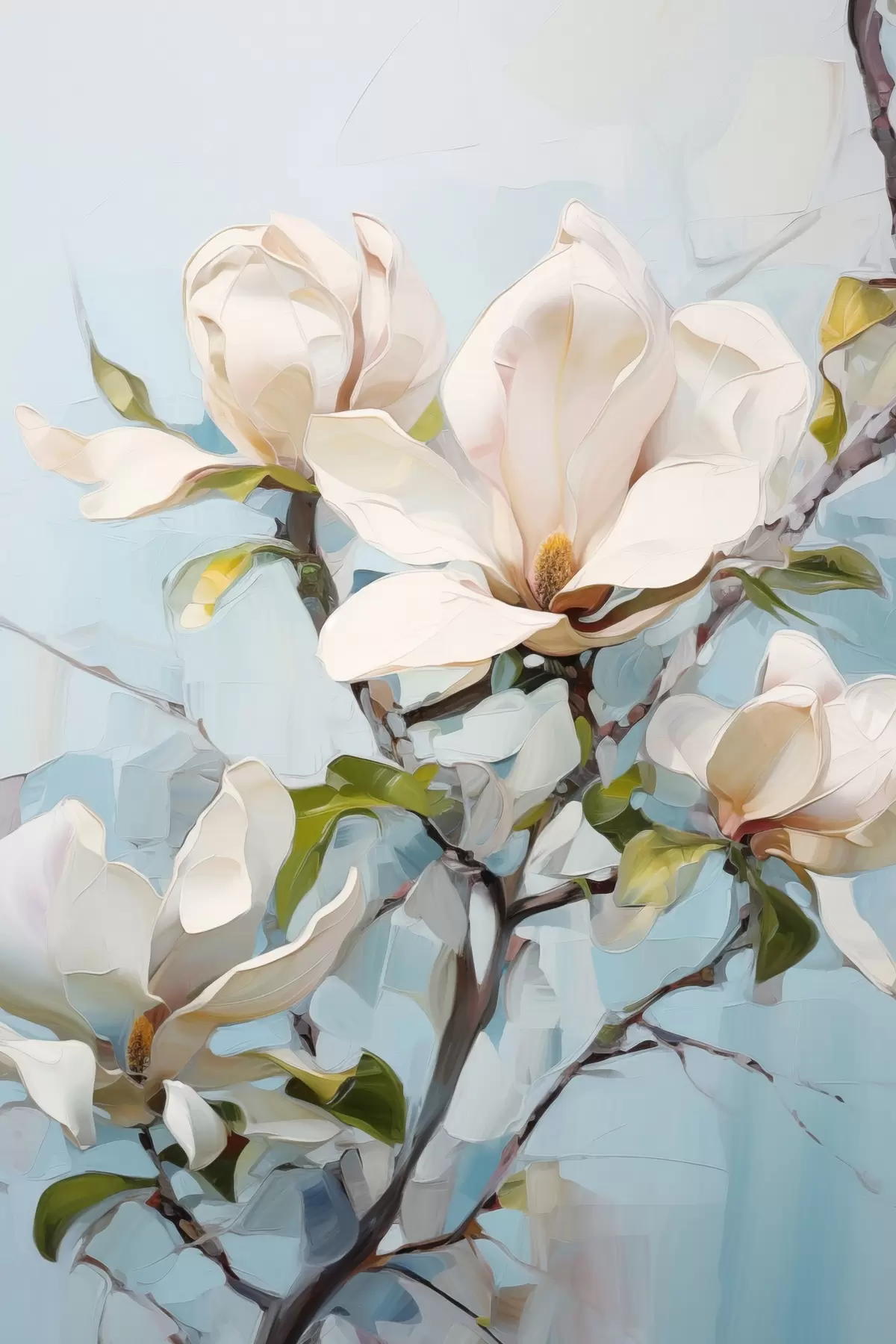 Poster Flori albe de magnolie, fundal albastru deschis cu tușe delicate, stil pictură în ulei, textură impasto Nr f46277