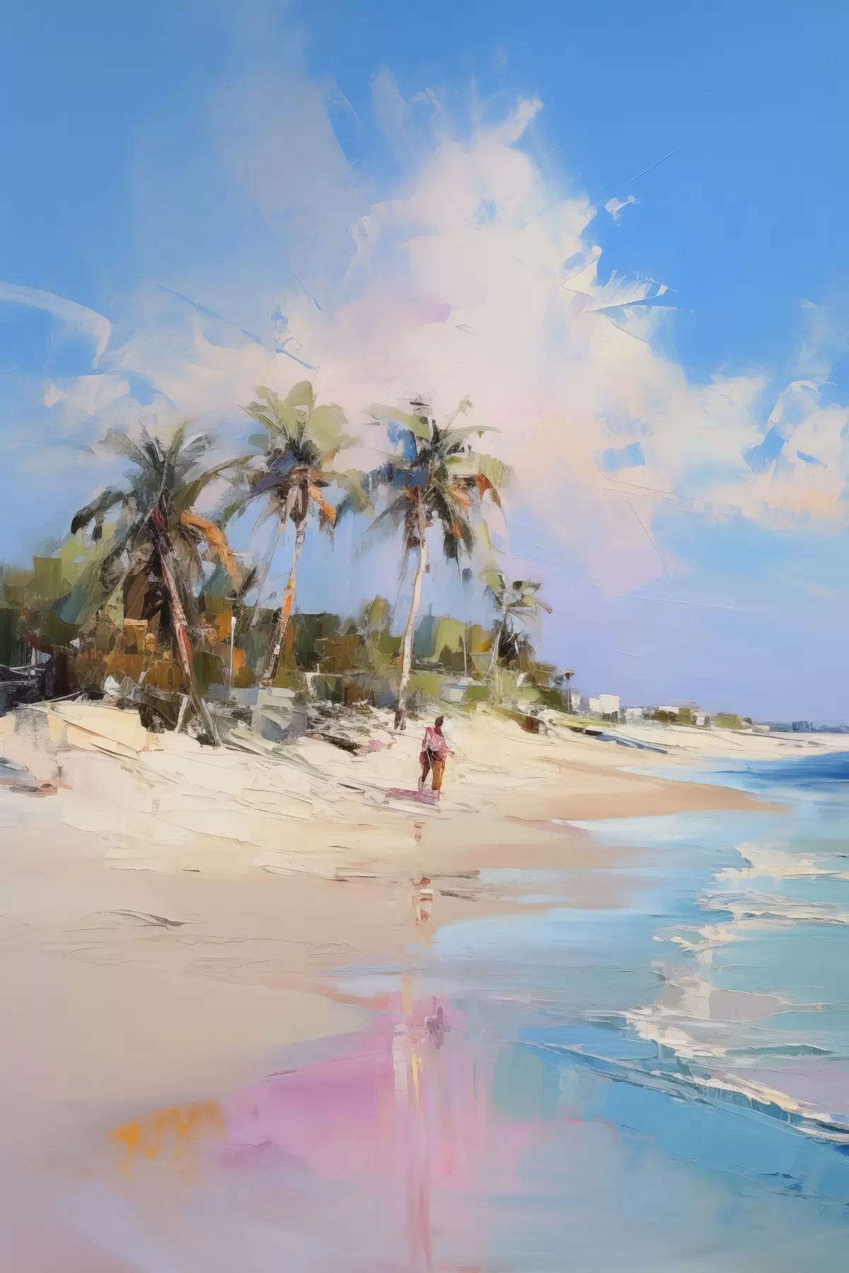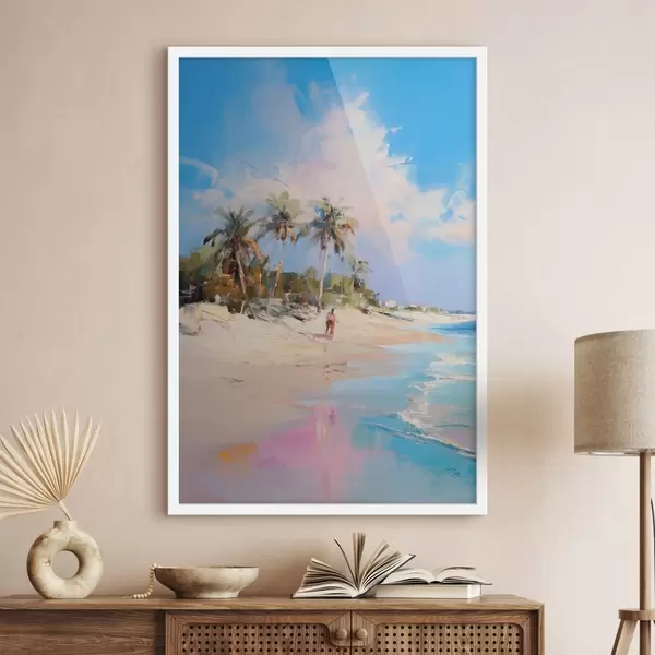 Poster Peisaj abstract, o plajă cu palmieri, o zi însorită cu cer albastru și câteva nori Nr f46284