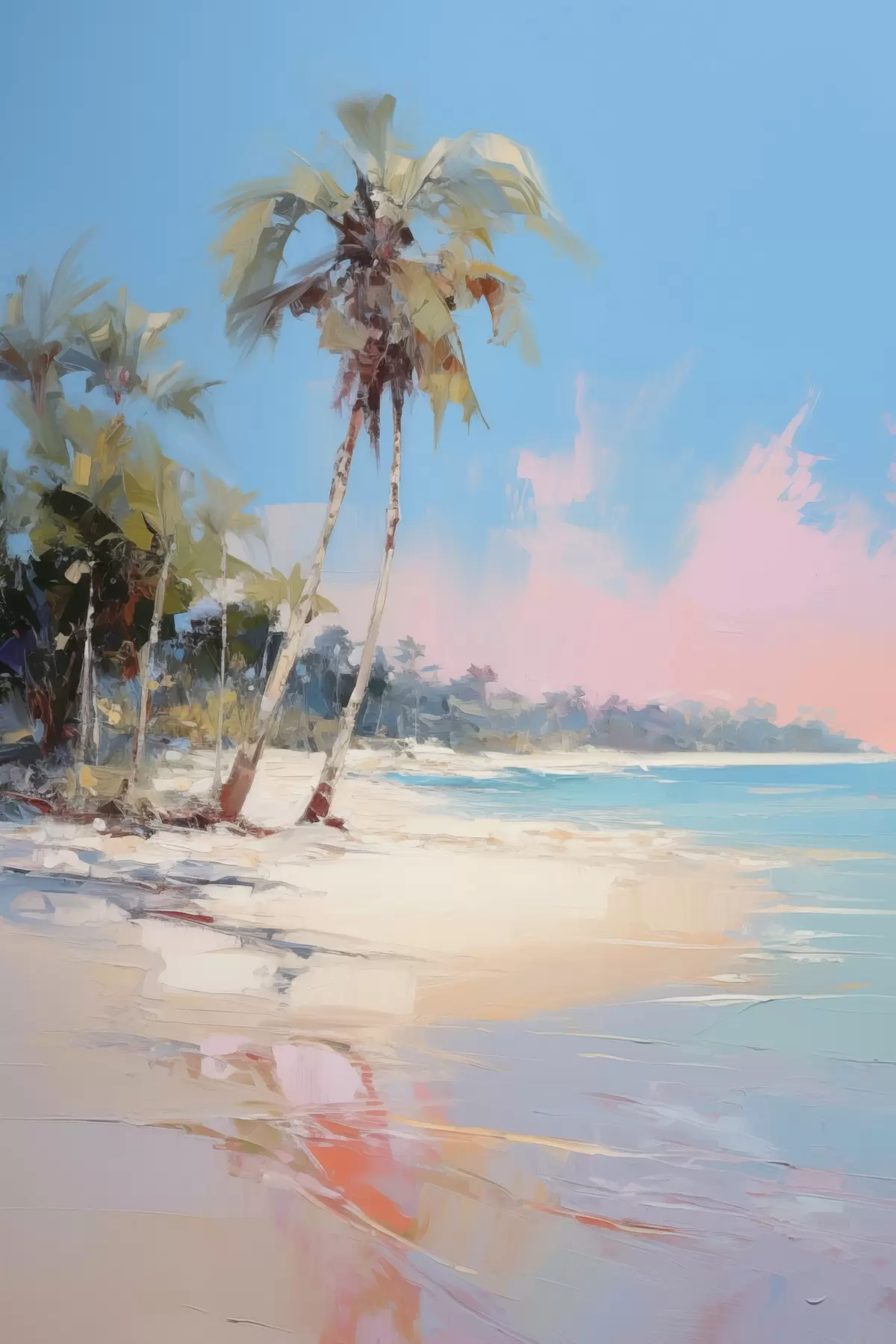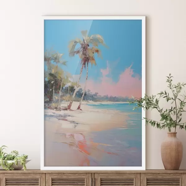 Poster Plajă tropicală abstractă cu nisip alb și palmieri, cer albastru cu nori albi Nr f46285
