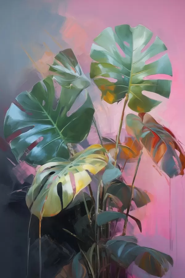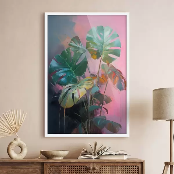 Poster Plantă abstractă monstera cu frunze verzi vibrante, pe un fundal de nuanțe delicate de roz și violet f46286