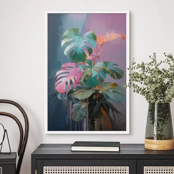 Poster Plantă abstractă monstera cu frunze roz și verzi, culori vibrante, pe un fundal estompat f46287