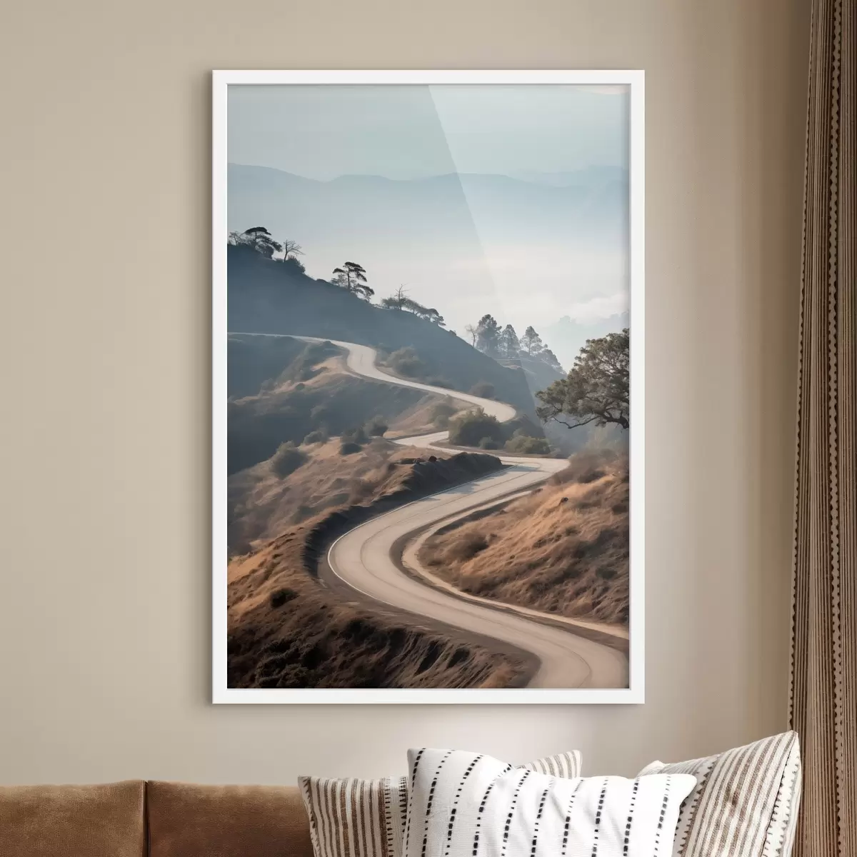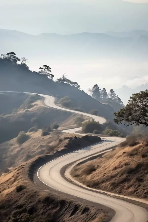 Poster Un drum sinuos prin peisajul deluros, cu iarbă uscată, sub un cer senin, cu munți în depărtare Nr f46289