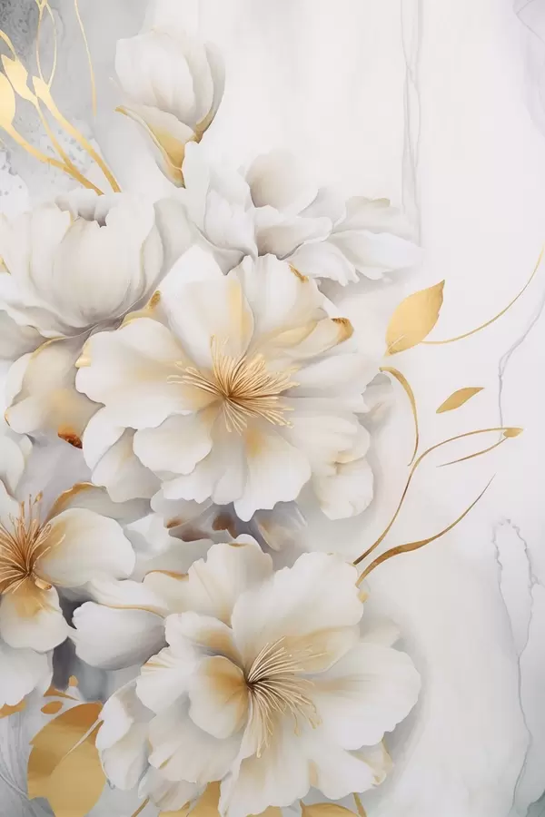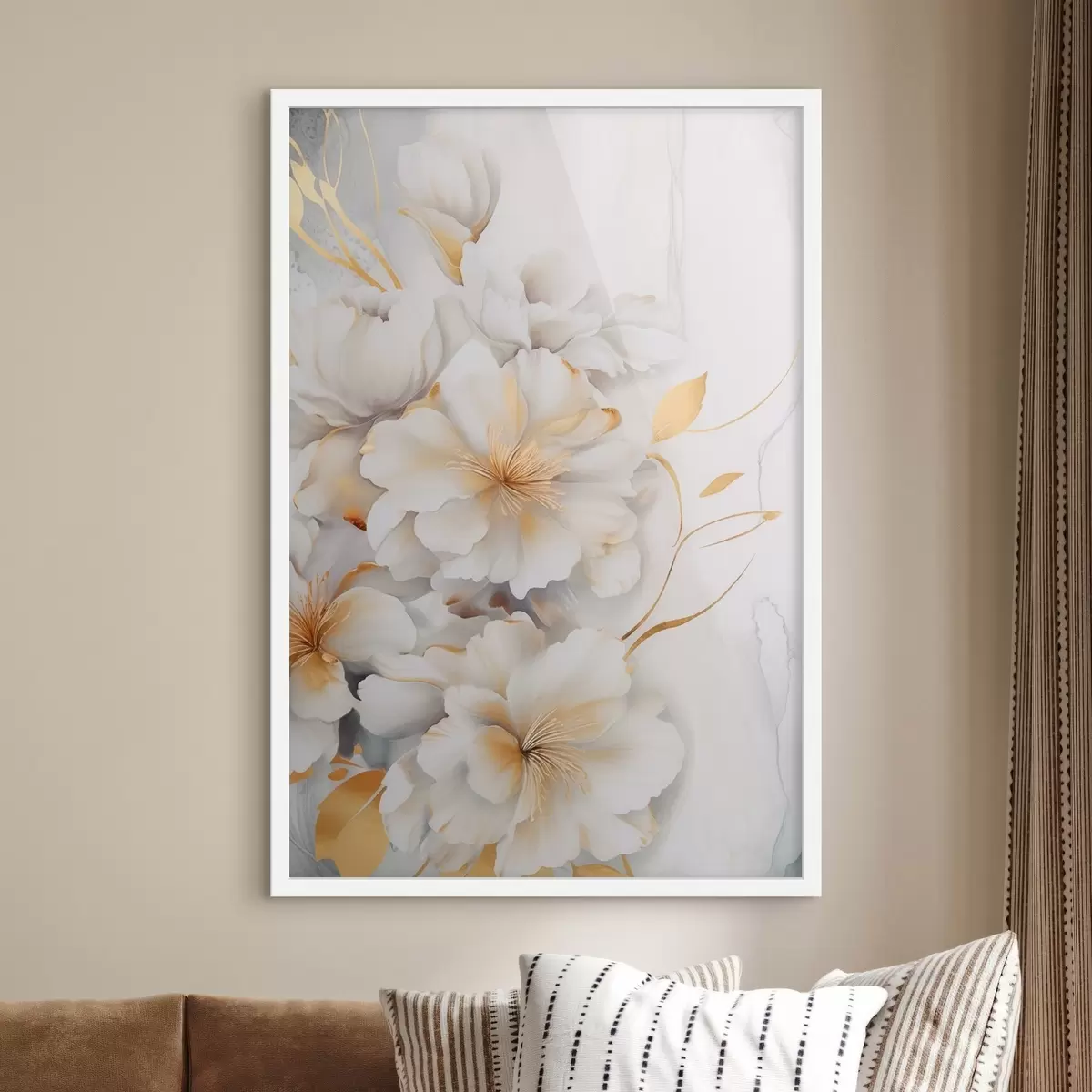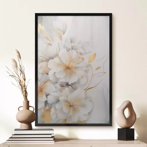 Poster Flori albe cu detalii galbene, petale cu umbre subtile, fundal deschis cu efect marmorat subtil Nr f46292