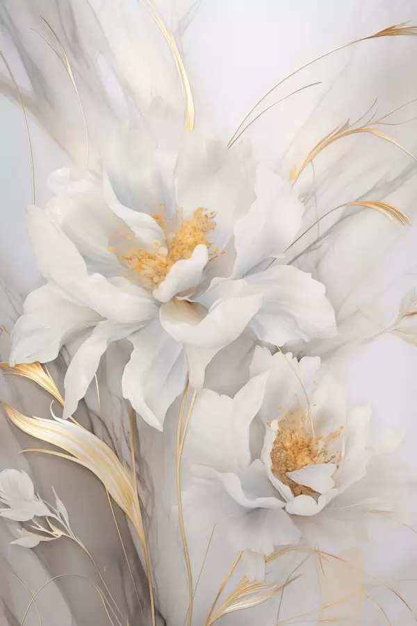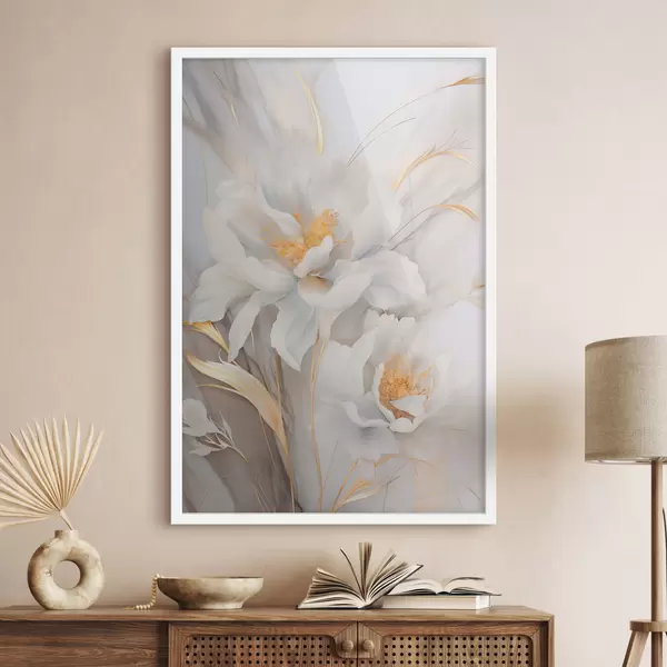 Poster Flori albe cu pistili și tulpini galbene, petale delicate, compoziție elegantă, fundal neutru Nr f46293