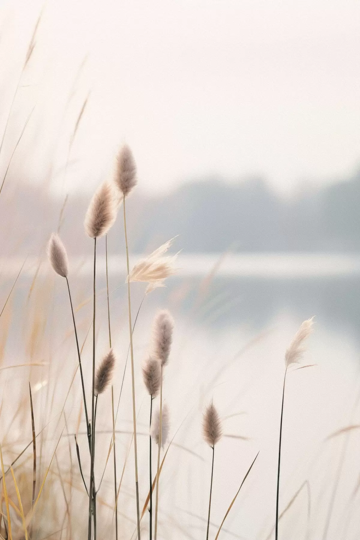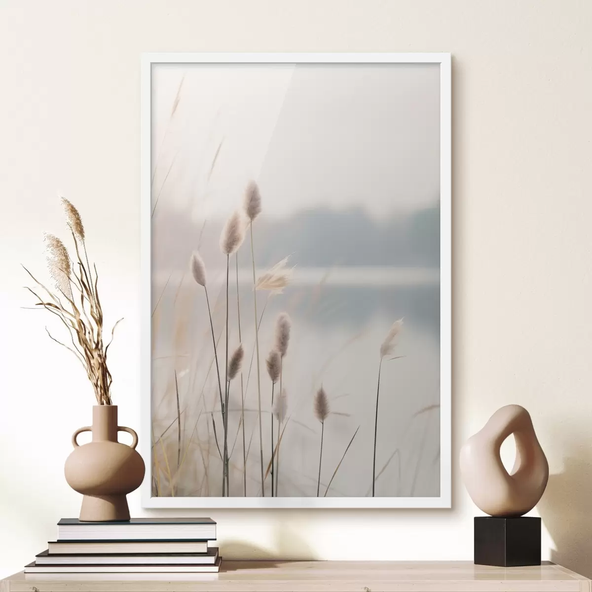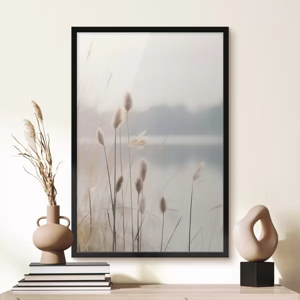 Poster Stuf moale pe malul unui lac încețoșat, tonuri pastelate de bej Nr f46504